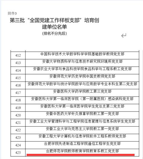 本网讯 近日,教育部办公厅发布了《关于公布第三批全国党建工作示范高校、标杆院系、样板支部培育创建单位名单的通知》,全国共遴选产生了11个全国党建工作示范高校、100个全国党建工作标杆院系、1000个全国党建工作样板支部培育创建单位,我院教师教育学院教育系教工党支部入选“全国党建工作样板支部”培育创建单位,获得党建工作新突破。