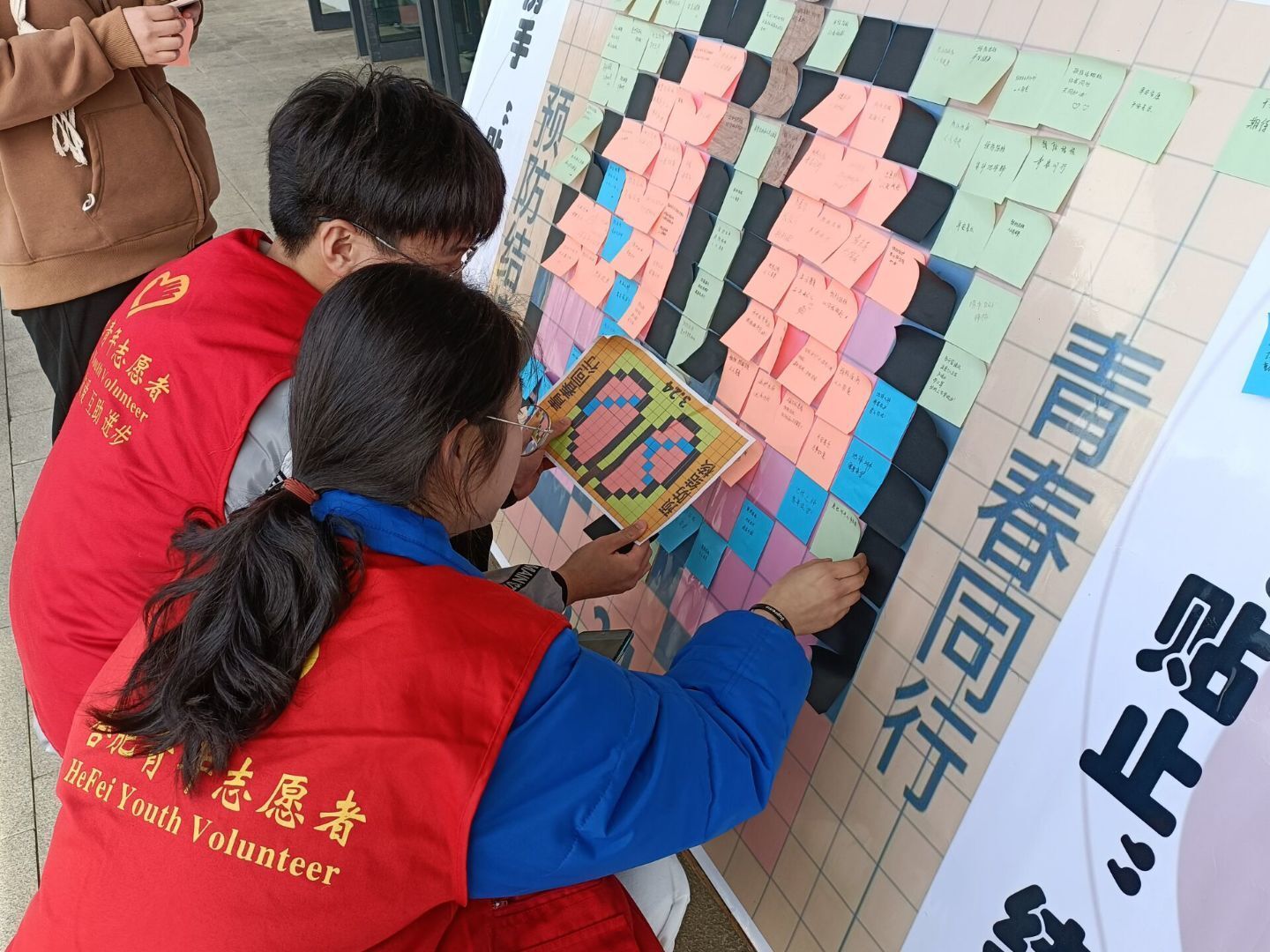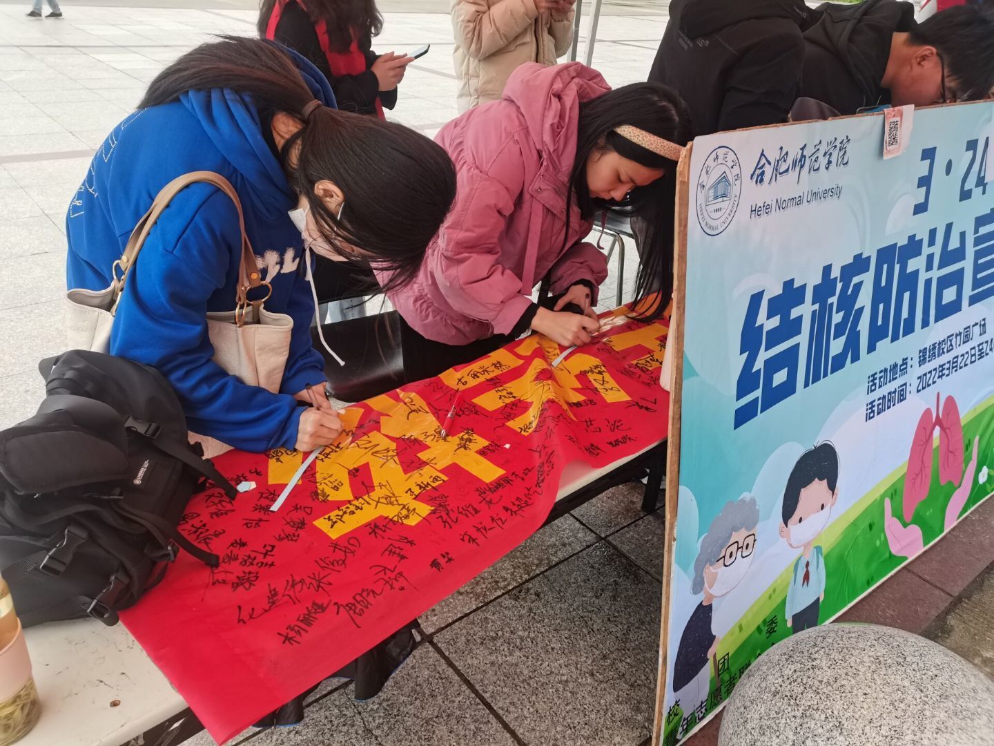 3月22日起,青志联于滨湖校区桂园餐厅和锦绣校区生活广场陆续开展了“折星祈愿送祝福”、“横幅签名表决心”、趣味漫画征集、结核知识问答等一系列子活动。展台前,同学们在志愿者的引导下保持间隔、有序排队,在祝福便签上留下对结核病患者的关爱鼓励,表达对医疗人员的感谢与敬意。
