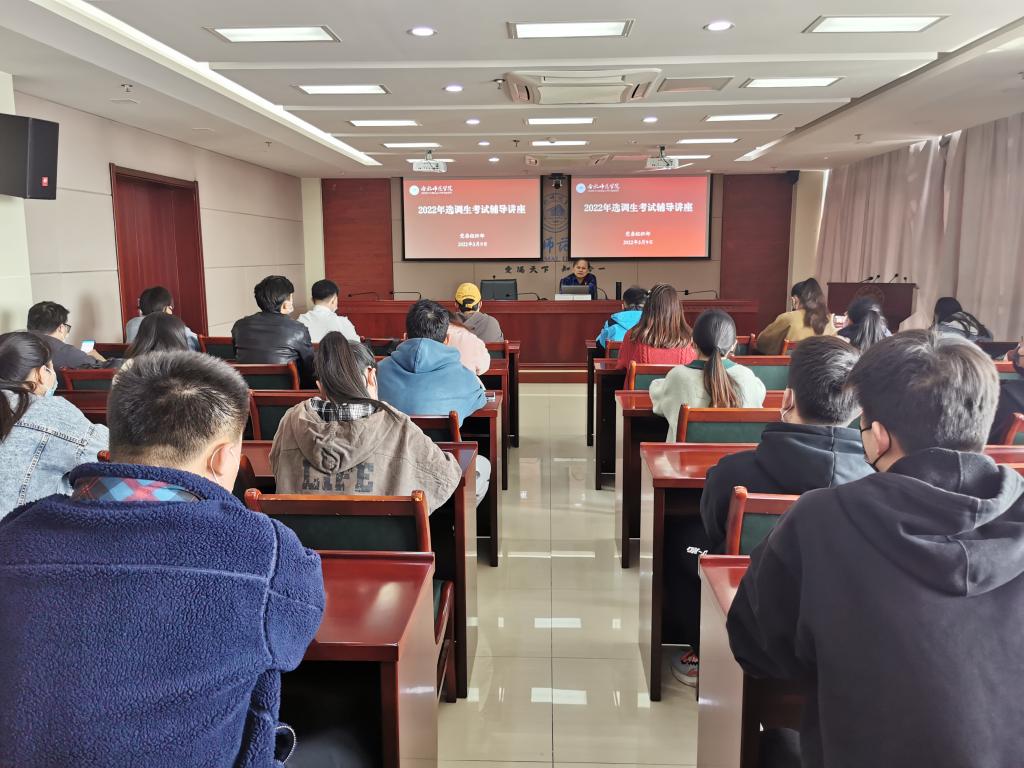 本网讯 3月9日,学院党委组织部邀请两位公务员与选调生考试资深辅导教师来院为2022年报考选调生的学生进行专题辅导,讲座由院党委委员、组织部部长华银峰主持,全体报考选调生参加辅导。