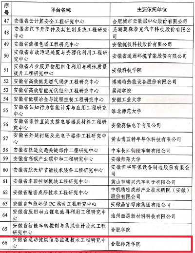 本网讯 日前,安徽省发展和改革委员会下发《安徽省发展改革委关于公布2021年度工程研究中心(工程实验室)批复、验收及评估结果的通知》(皖发改创新〔2022〕51号),同意组建70家省工程研究中心。我院申报的省工程研究中心“安徽省运动健康信息监测技术工程研究中心”获批组建。