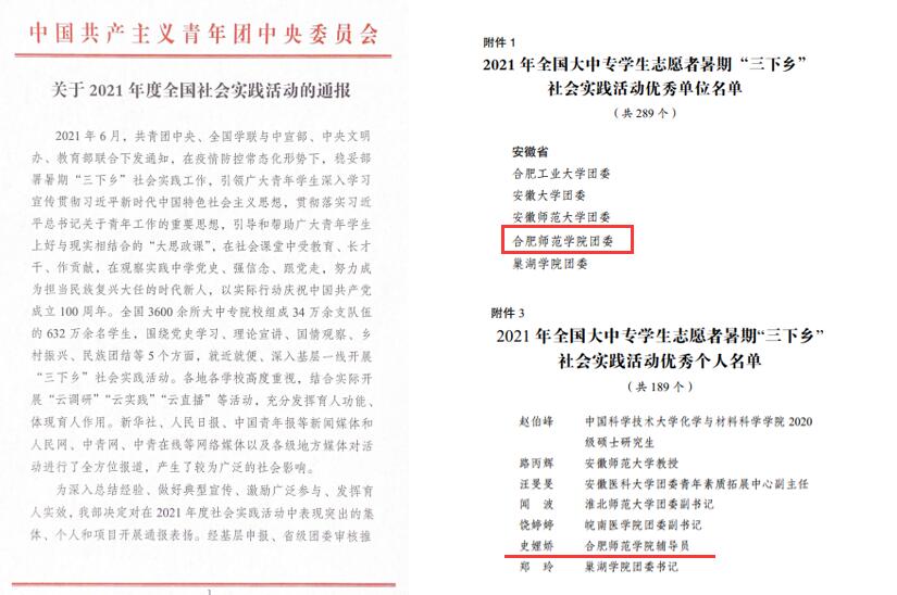 又讯,省委宣传部、省文明办、教育厅、团省委、省学联近日联合公布了2021年安徽省大中专学生志愿者暑期“三下乡”社会实践活动评选结果,我院获得多项表彰。外国语学院“月时为卿爱心服务队”、合师青年传媒中心“合师青年了不起”2支团队获评2021年全省大中专学生志愿者暑期“三下乡”社会实践活动优秀实践团队;刘铭传学院团委书记宗彪、院团委王露2名教师获评2021年全省大中专学生志愿者暑期“三下乡”社会实践活动优秀个人;获评2021年全省大中专学生志愿者暑期“三下乡”社会实践活动优秀调研报告一等奖1个、二等奖1个、优秀奖1个;在长三角高校大学生重走革命路专项社会实践活动评比中,获评优秀团队1个、优秀调研报告1个、最美人物1个,获奖数量和质量均位居全省高校前列。(院团委)