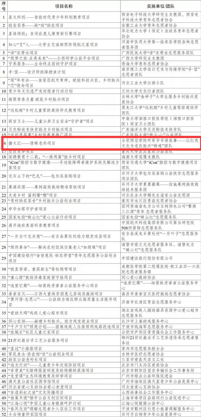 本网讯 由共青团中央、中央文明办、民政部、水利部、文化和旅游部、国家卫生健康委员会、中国残疾人联合会联合等7部委联合主办,第五届中国青年志愿服务公益创业赛全国赛终评于11月25日-26日举行,102个全国赛终评入围项目通过线上进行了路演答辩,20位评委专家在线对项目进行了提问和指导。经专家评审,我院电子信息与电气工程学院大学生志愿服务品牌项目《播火记——情暖老兵》获评全国铜奖。
