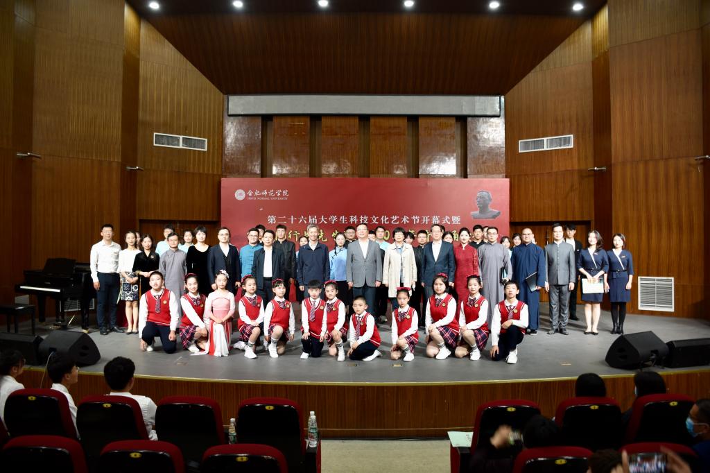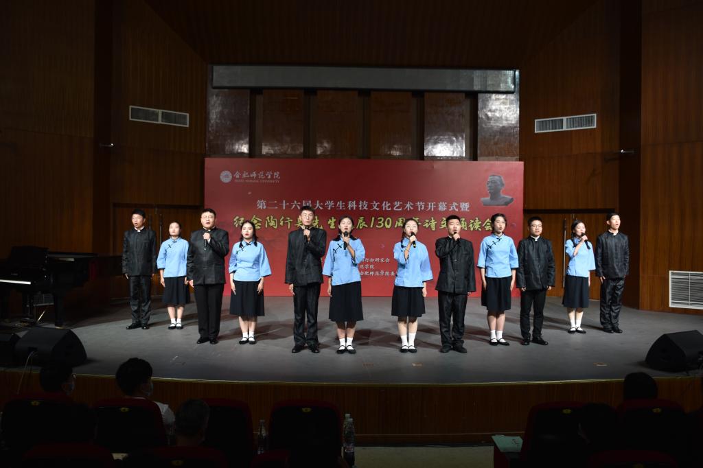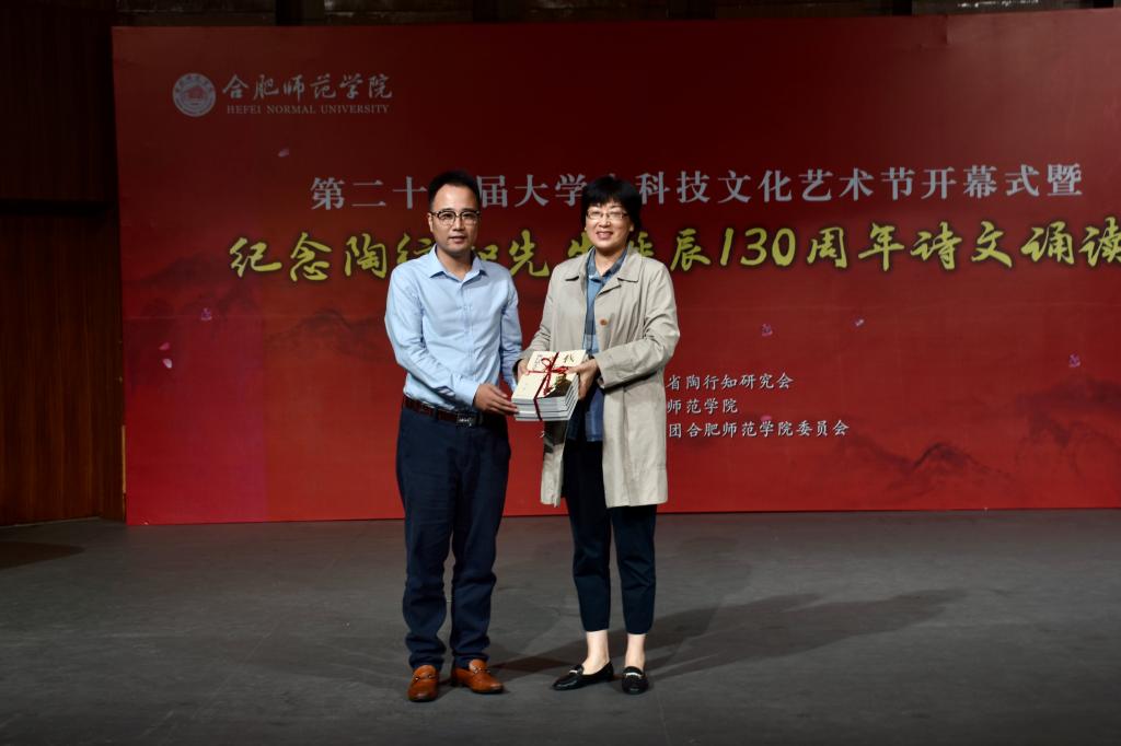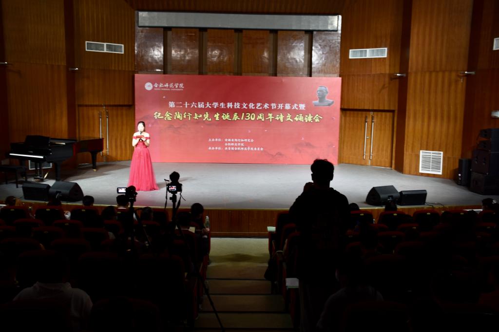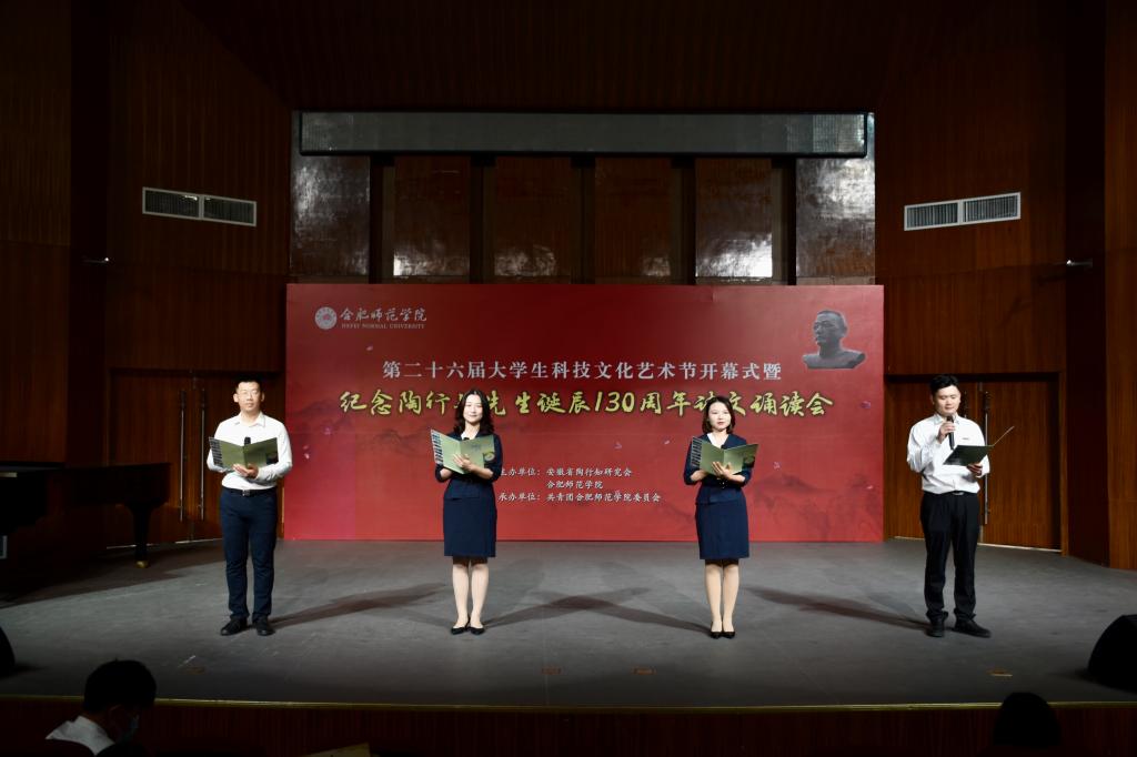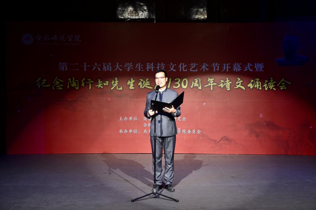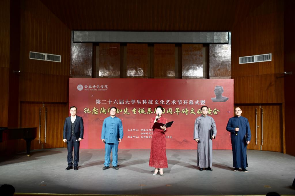本网讯 10月13日下午,由安徽省陶行知研究会、beat365唯一官方网站主办的学院第二十六届大学生科技文化艺术节开幕式暨纪念陶行知先生诞辰130周年诗文诵读会在锦绣校区音乐厅隆重举行。上海市陶行知纪念馆副馆长、陶行知曾孙陶侃,中国陶行知研究会副会长、安徽省陶行知研究会会长、院党委书记徐成钢,党委副书记、院长方东玲,副院长谢阳群,副院长姚本先,副院长曹卓良,纪委书记徐文林及学院校园文化建设和“学陶师陶”活动领导小组全体成员,各二级学院党团组织负责人,学生代表到场观看。