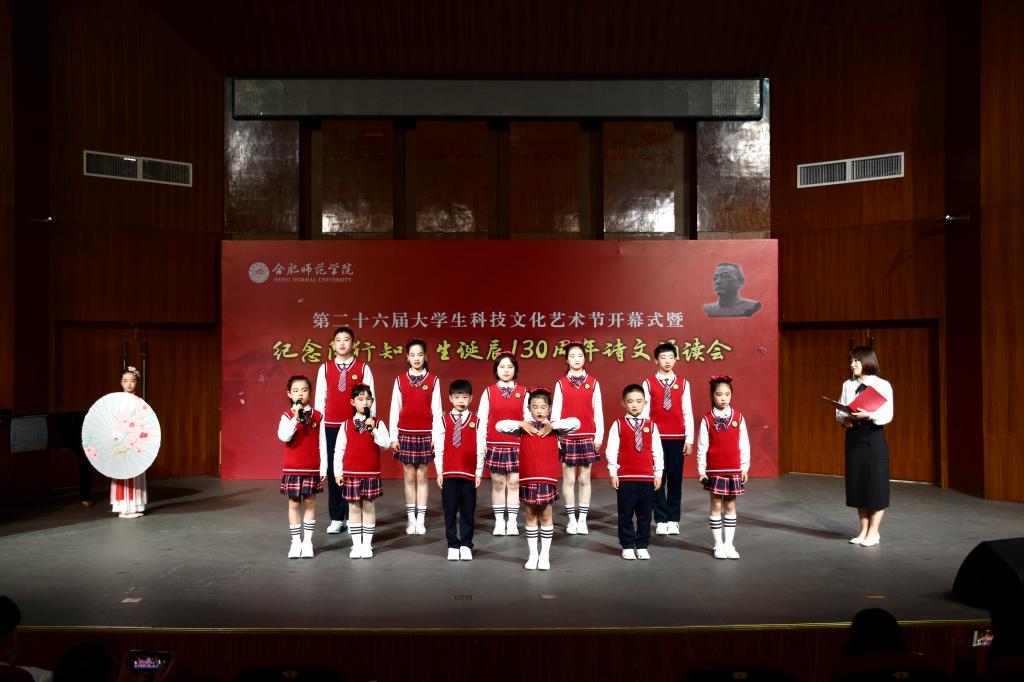 院团委的《知行求真》拉开了诵读会的序幕,让在场师生仿佛回到了那个漫漫求索的年代;教师教育学院的《中国乡村教育之根本改造》将眼光转向乡村,带我们共赏了中国乡村教育的知与行;心有阳光、踏实践行,用今天的创造决定明天的模样,院广播台一首《创造宣言》在人们心中埋下创造的种子;风华正茂少年时,桃李芬香满天下,音乐学院用《行知师颂》深情演绎了陶行知先生的三首诗歌,朴素的语言传达出教育的真谛;一路同行,用爱心和责任心伴随学生成长,辅导员协会带来的《我们都是行知人》阐述着辅导员以陶行知为师的付出和感动;合师院附属西安路学校的老师和同学们带来了《行知路上好少年》,用稚嫩的童声展现“请党放心,强国有我”的坚定信心;青年志愿者联合会一首《行知志愿》让大家明白求知路中“行”之重,展现了合师青年志愿者不怕艰辛的风采;十年树木、百年树人,教工青轻读书会带来的《行知家书:穿越时空的对话》以陶行知先生与新时代的教育者之间穿越百年的书信,展示了教师教育报国、乐育英才的永恒初心;教育如雨、温润无言,安徽省朗诵艺术学会张春声情并茂地朗诵了《第一流的教育家》,令人撼心动情;教工青轻读书会的《捧着一颗心来,不带半根草去》倾情回忆了陶行知先生光辉的一生,声情并茂地诵读了陶行知先生教育思想的精髓要义,台上台下激情互动,全场观众起立齐诵“捧着一颗心来、不带半根草去”,为诵读会画上了圆满的句号。