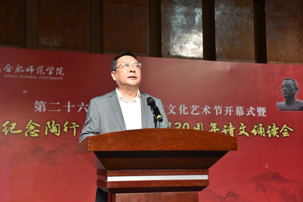 徐成钢代表安徽省陶行知研究会和学院党政致辞,对出席活动的来宾表示诚挚欢迎,对本届大学生科技文化艺术节的开幕表示热烈祝贺,对积极组织和参与艺术节各项活动的老师和同学们致以亲切问候。他指出,陶行知先生为中华民族教育事业的振兴和创新奉献了一生,他的教育思想和理念,在130年后的今天依然闪耀着时代的光芒,对新时代教育事业发展依然具有重要的启示作用。他介绍了学院近年坚持把“学习陶行知、师承陶行知”作为校园文化建设主线,深入开展“学陶师陶”活动的做法和成效。他强调,大学生科技文化艺术节是学院弘扬行知精神,提升校园文化内涵,培养学生科学精神和综合素质的传统文化活动盛会,本次活动是借艺术节开幕式这个舞台,以诗文诵读会的形式,缅怀和纪念陶行知先生。希望同学们学习传承发扬陶行知先生的教育思想,积极参与各项科技文化活动,从中接受行知文化熏陶,培养高雅艺术品位,提升实践创新能力,弘扬社会主义核心价值观,践行“爱满天下、知行合一”的校训精神,争做新时代有理想、有担当、有作为的“陶子”,努力成长为堪当民族复兴重任的时代新人。他最后宣布,beat365唯一官方网站第二十六届大学生科技文化艺术节开幕。