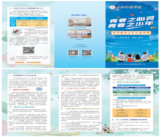 同时,心理健康教育中心编印了16000份“精神卫生日”彩色宣传折页,免费发放给全院所有学生。在进一步宣传精神卫生健康知识同时,提供了我校心理中心与权威精神卫生机构的心理服务热线,为同学们提供及时贴心的服务。