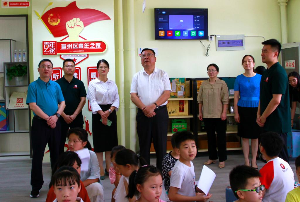 徐成钢、卢蓉一行分别走访了今年在宣城市宣州区和泾县开办的6所行知学堂,参观了宣州区青年之家。在宣州区敬亭山街道巷口桥社区行知学堂,小先生们正带着小学员们排练合唱《不忘初心》,嘹亮的童声响彻教室。在宣州区向阳街道双河社区,正在进行绘画课,小学员们在小先生们的带领下,用画笔画出自己对未来美好生活的向往。在泾县云岭镇长园村行知学堂,小先生正在讲授新四军文化课程,教育小学员们缅怀革命烈士,继承革命传统,努力学习,报效祖国。大家认真聆听,仔细观看,并与小先生、小学员们进行了交流,对于教学质量和效果给予充分肯定。在宣州区水东镇南阳村行知学堂、宣州区飞彩街道莲西社区行知学堂、泾县昌桥乡孤峰村行知学堂,大家一起观看了小先生和小学员精心准备的读书分享会、小合唱、诗歌朗诵等活动。