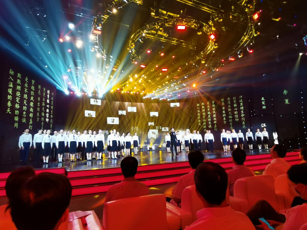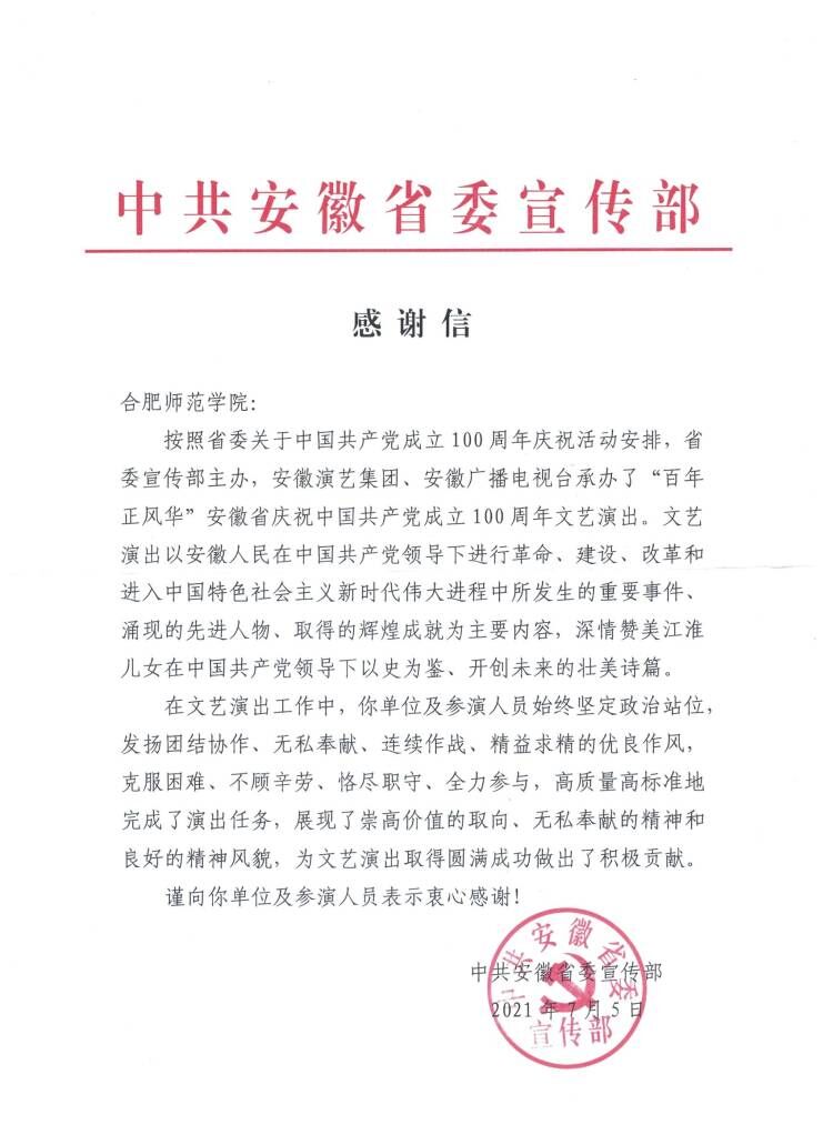 本网讯 7月5日晚,“百年风华正青春”安徽省庆祝中国共产党成立100周年正能量网络作品展演在安徽广播电视台举办。省委常委、省委宣传部部长陶明伦出席。我院音乐学院合唱团受邀参演情境合唱节目《血脉》,表达了我院青年学子对党的百年华诞的深情祝福和坚定传承红色基因、永远听党话跟党走的决心。院党委书记徐成钢到场观看了演出。演出于7月15日晚在安徽卫视播出。