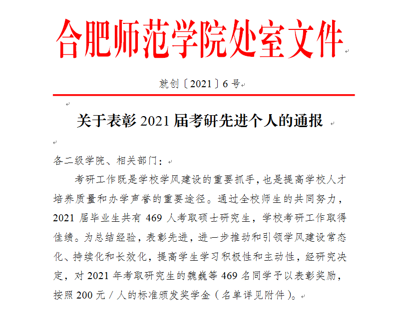 今年我院2021届本科毕业生共计3922人(其中安徽省定向培养乡村教师93人),截至目前共有469名同学考取研究生,考研录取率达12.25%;其中180名同学被“双一流”高校录取,名校录取率达38.38%。共有47人获得香港城市大学、香港教育学院,英国伦敦大学、约克大学、伯明翰大学等境外高校研究生录取offer。考研学生中更是涌现出物理与材料工程学院2017级材料科学与工程班和马克思主义学院2017级思想政治教育班考研录取率分别高达51%和40%的“学霸班级”,1栋429宿舍6名男生全部被211高校录取的“学霸宿舍”等优秀集体。这些优异成绩的取得,既是考研学子寒窗苦读、不懈奋斗的结果,也是学院以全面提高人才培养能力为重点,不断注重内涵建设,提高教学质量的重要体现。