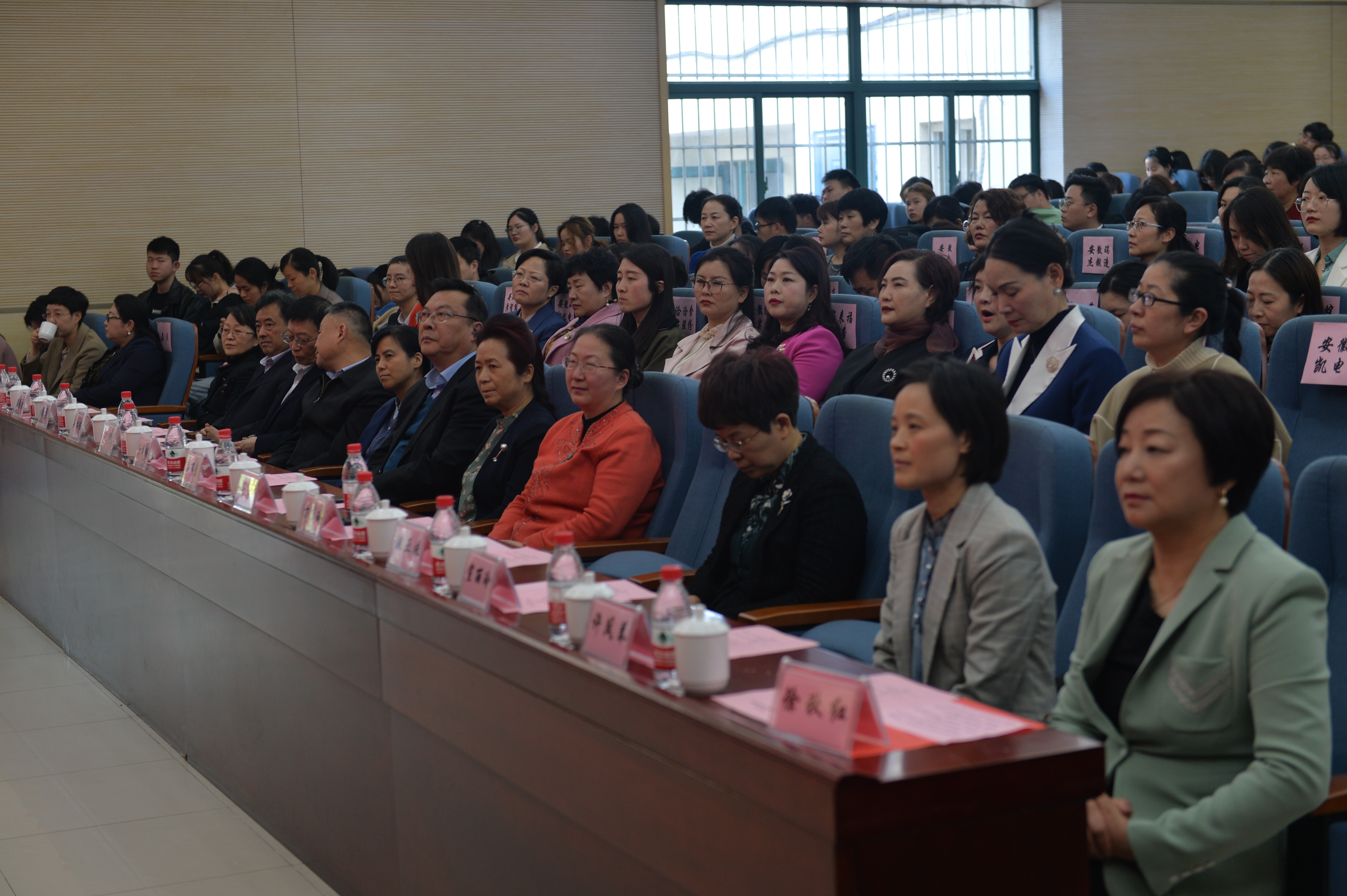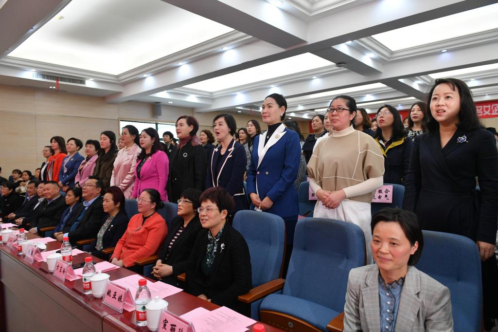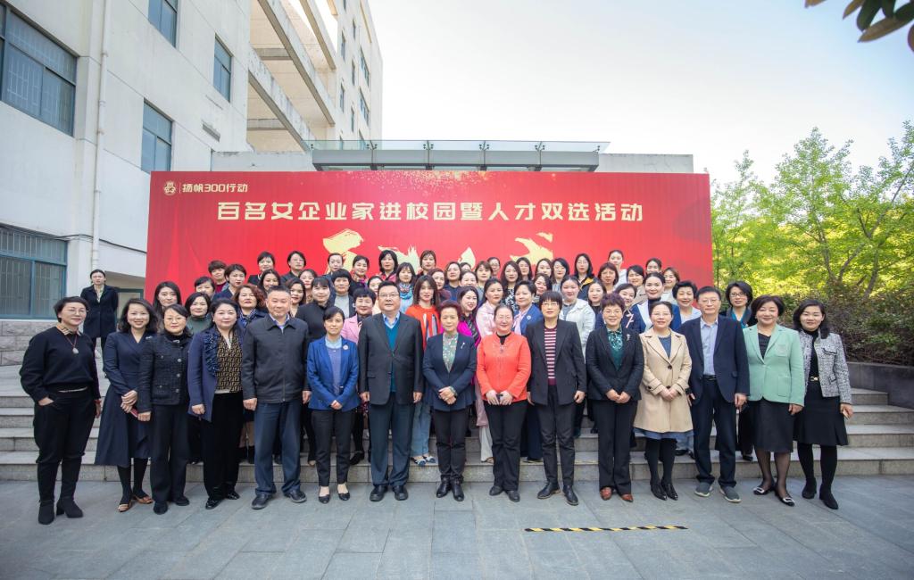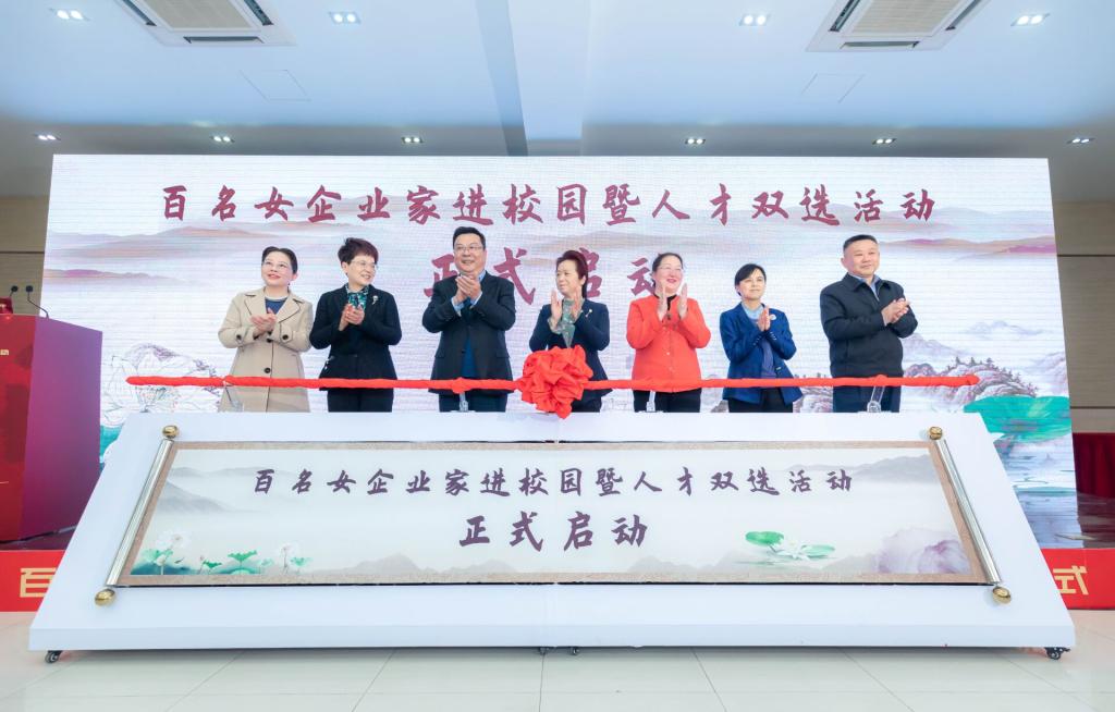 孙丽芳、刘苹、徐成钢、赵明、姚亚妹、吴松保、宣丽玲一起在主席台前,共同启动百名女企业家进校园暨人才双选活动。
