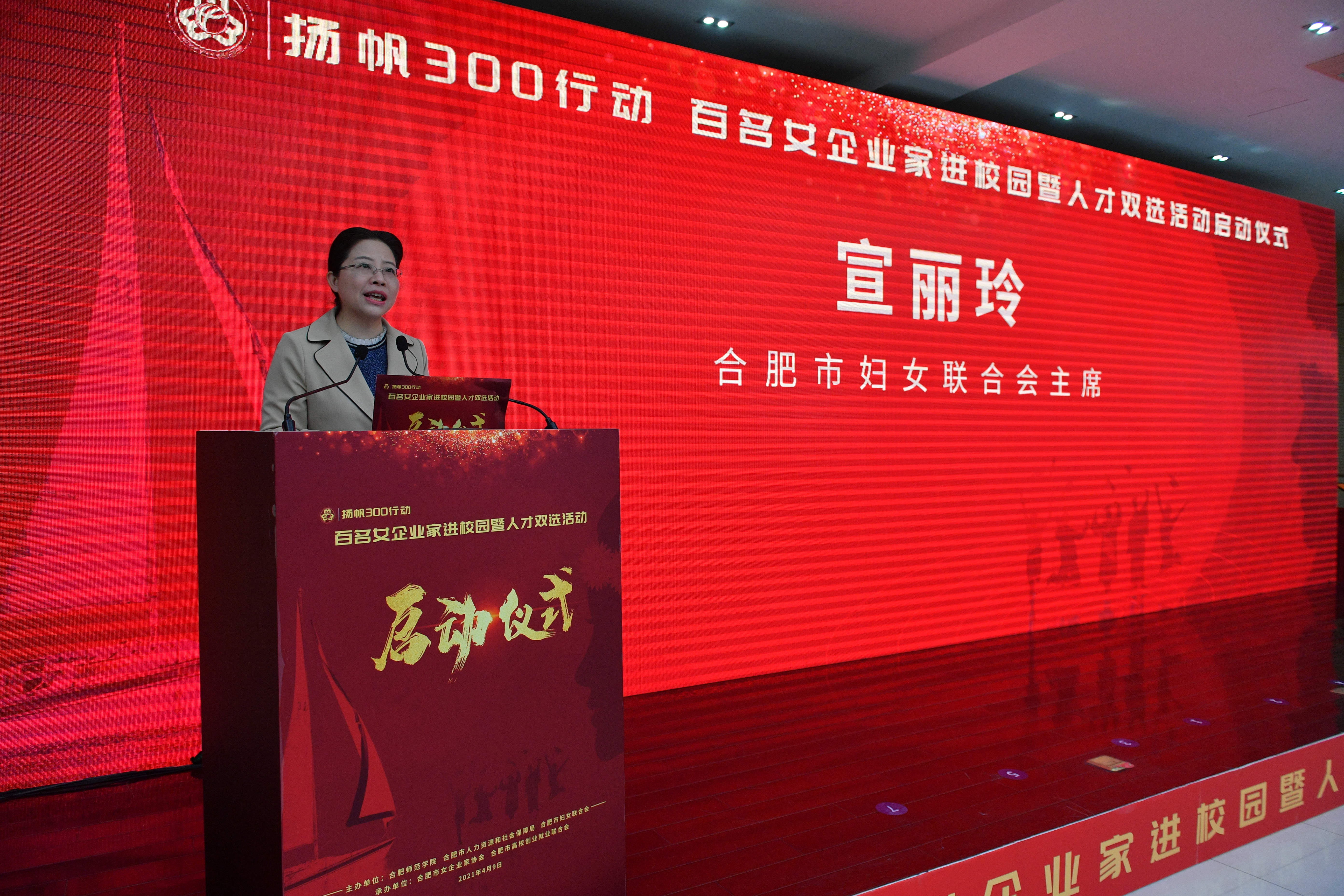本网讯 仲春时节,万物葱茏。为全面融入地方经济社会发展,积极响应长三角一体化国家发展战略号召,充分发挥长三角区域女企业家在引领大学生创业、助推产学研创新、加快人才培养上的能动性和独特优势。4月9日下午,由beat365唯一官方网站、合肥市人力资源和社会保障局、合肥市妇女联合会主办的“扬帆300行动”百位女企业家进校园暨人才双选活动启动仪式在学院锦绣校区学术报告厅举行。省政协副主席孙丽芳、省妇女联合会主席刘苹、院党委书记徐成钢、院党委副书记、院长方东玲、合肥市人民政府副市长赵明、合肥市政协副主席姚亚妹、合肥市人力资源和社会保障局局长吴松保等相关单位领导和来自长三角50名女企业家宣讲团代表及学院150多名学生参加了活动。启动仪式由市妇女联合会主席宣丽玲主持。