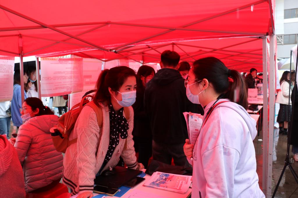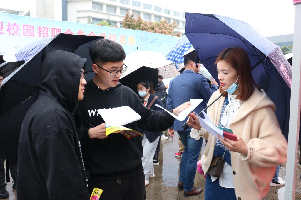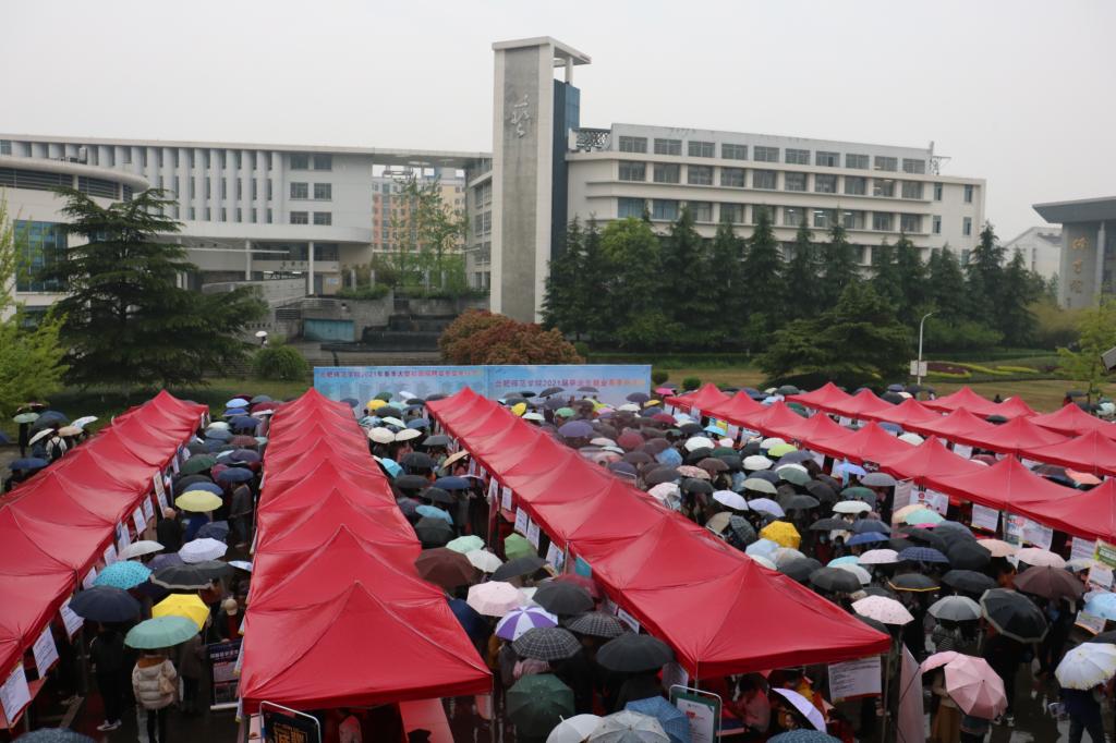 本网讯 为抓住毕业生就业“窗口期”“黄金期”,促进毕业生更充分更高质量就业,4月7日下午,由省大中专毕业生就业指导中心主办、我院承办的2021届毕业生就业春季双选会在锦绣校区博约楼南广场成功举行。省大中专毕业生就业指导中心主任袁江林,信息部主任崔松革,学院党委书记徐成钢,党委副书记、院长方东玲,党委副书记吴昕春,副院长谢阳群、姚本先、曹卓良,纪委书记徐文林及各二级学院党政负责同志等到会指导并巡视了双选会现场。来自锦绣校区、三孝口校区的上千名毕业生在辅导员的带领下冒雨参加了双选会。