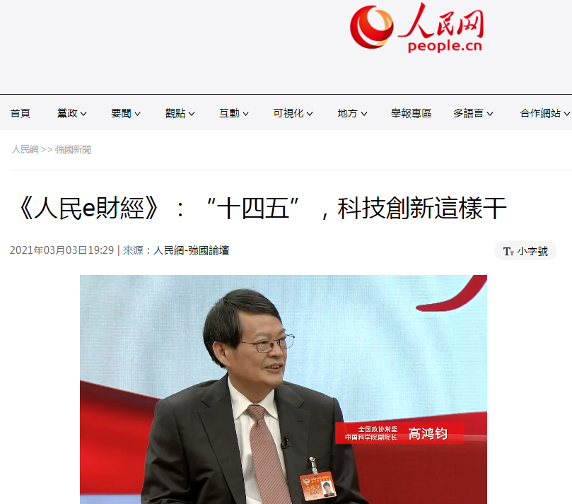 关于如何加强科技创新,人民网强国论坛部、人民日报麻辣财经工作室和全国党媒信息公共平台联合推出的新媒体访谈节目——《人民e财经》,对全国政协常委、中科院副院长高鸿钧、中科院科技战略咨询研究院院长潘教峰进行了专访。