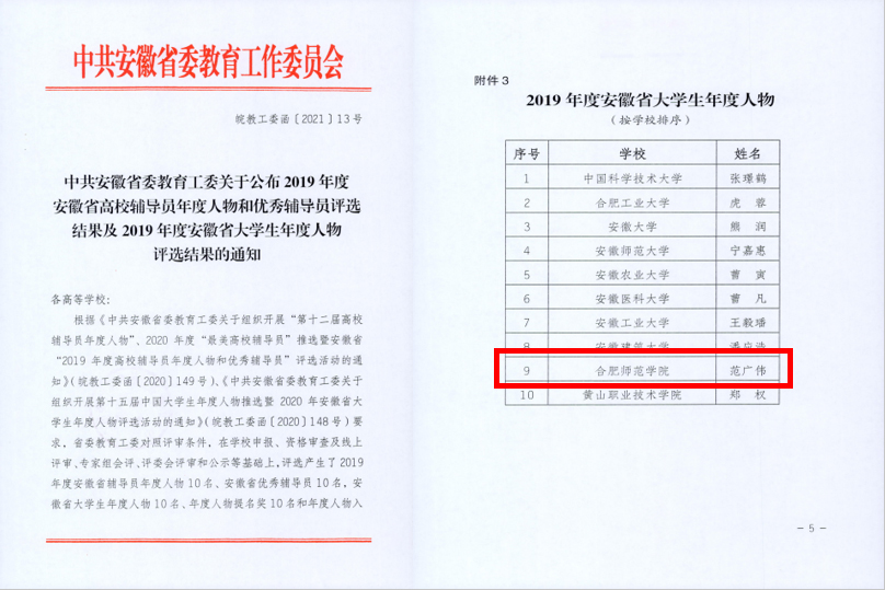 此次评选工作按照表彰先进,激励和引导广大青年学生坚定理想信念,志存高远,展现当代大学生良好精神风貌的原则进行评选,全省共有10名大学生荣获2019年度“安徽省大学生年度人物”称号。(校团委:王露)