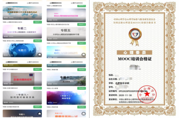 线上MOOC培训依托“全国高校心理委员工作平台”进行,经过14个专题的MOOC培训,2020级班级心理委员对心理健康知识与工作职责有了初步的认识,并全部通过测试获得心理委员MOOC培训合格证书。