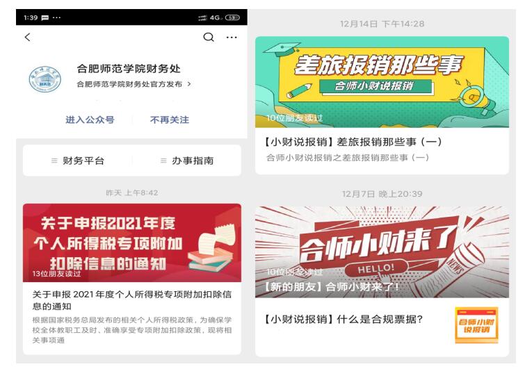 以财务信息化建设为抓手,推进财务信息管理平台建设。坚持以师生需求为导向,不断完善优化各模块的加载内容,简化操作流程,编写系统使用操作手册,建立答疑解惑平台,提升教职工网上办理业务的便捷程度及体验满意度,提升财务信息质量与服务水平,实现多维度、多渠道的财务管理。平台全年教职工访问量达20000余次,学生访问量达230000余次。充分依托财务处官方微信公众号,构建信息平台访问端口,设置合师小财虚拟人物,发布财务咨询、业务流程,普及财务规章制度,陆续推出“小财说报销”、“小财播报”、“助学贷款那点事”等系列合集,充分满足教职工实时查询及咨询业务的需求。目前,微信公众号关注总人数22000余人,阅读总量76000余次。