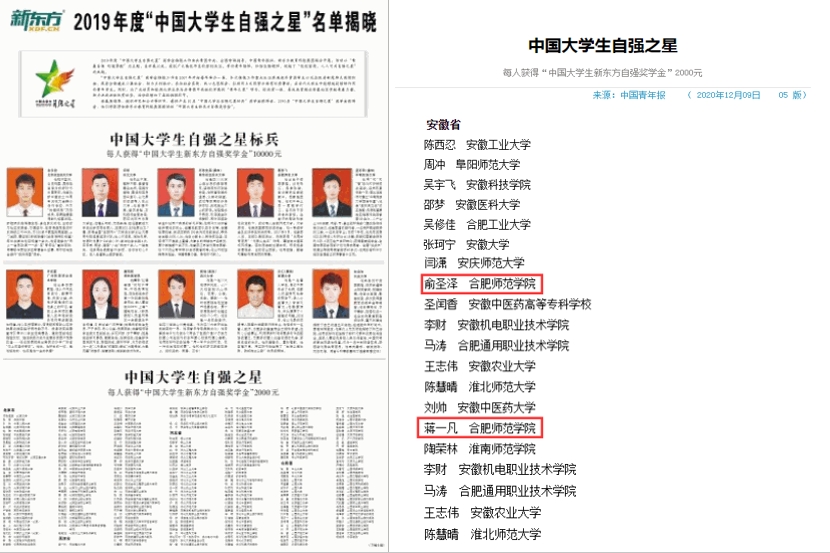 我校于2020年6月启动2019年“自强之星”寻访活动。学校高度重视该项工作,校团委充分运用新媒体平台发动寻访活动宣传,认真组织各二级学院积极申报,经二级学院申报、校团委评审后,推荐的蒋一帆、俞圣泽两名同学参加全国评选并双双入选。