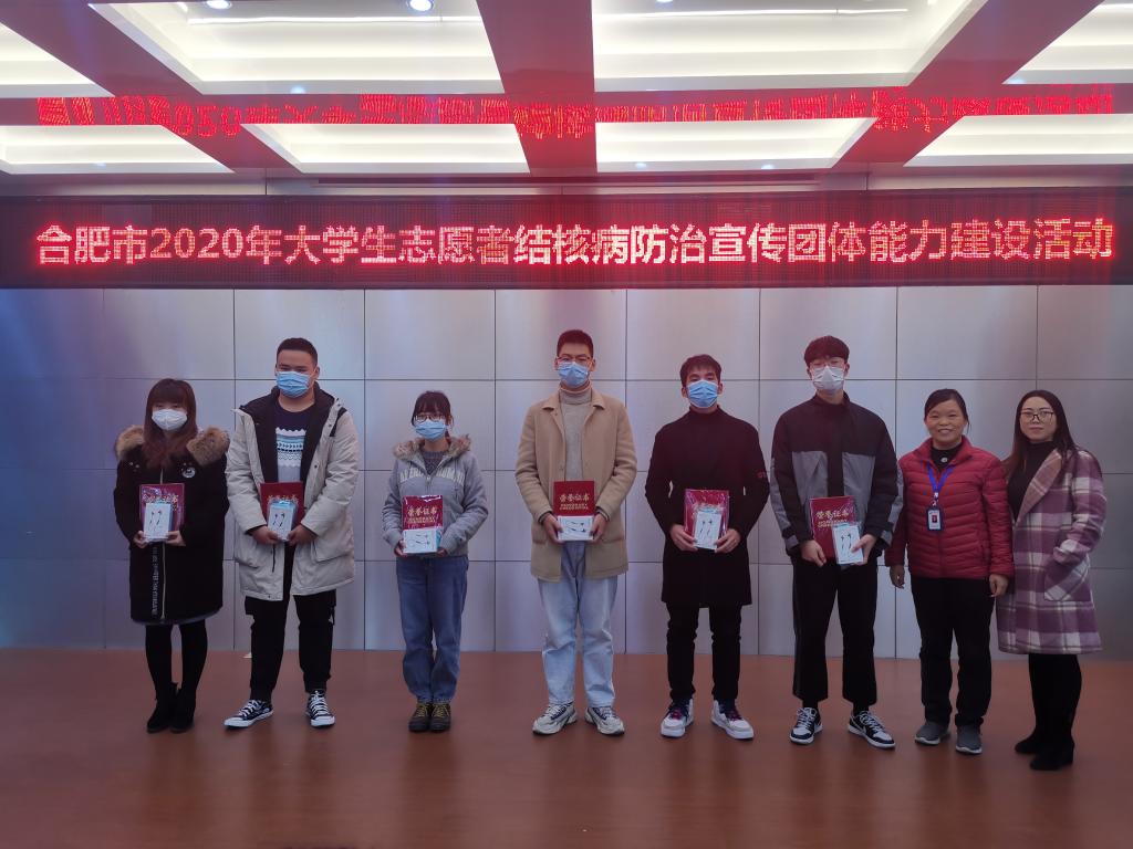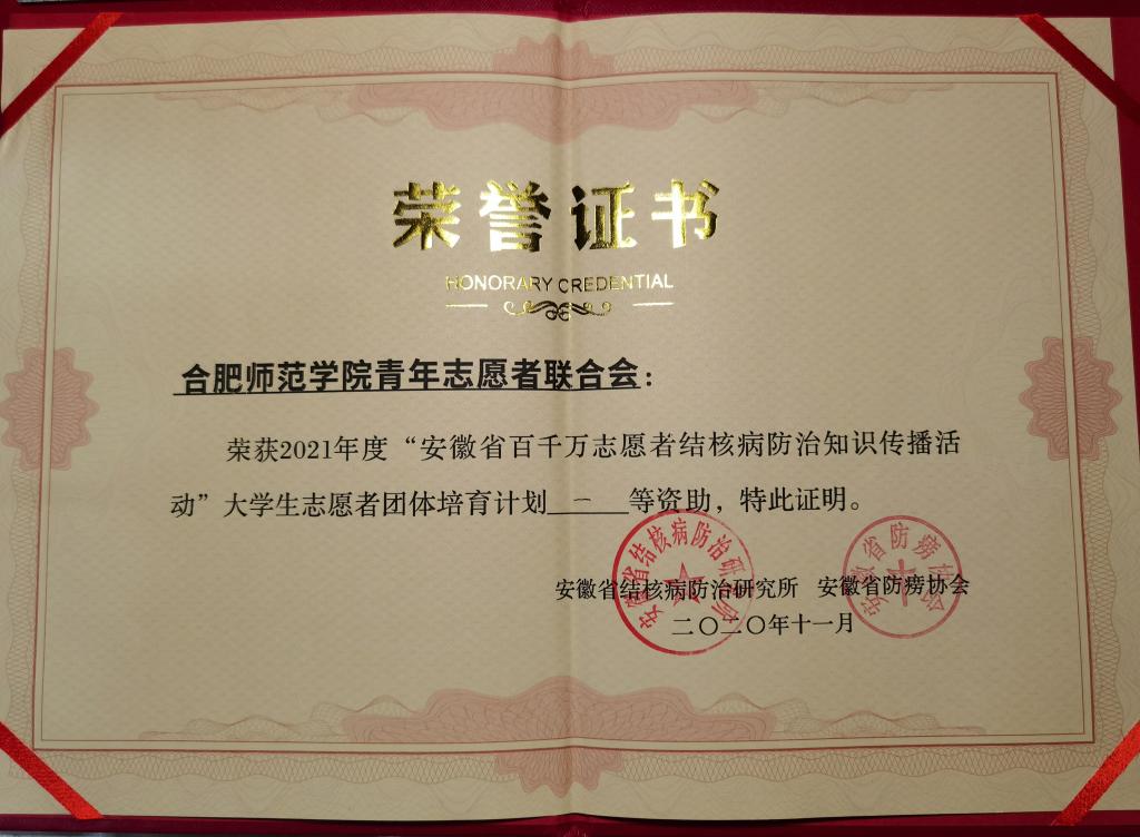 本网讯 12月13日,“安徽省百千万志愿者结核病防治知识传播活动”暨“2021年度大学生团体培育计划”颁奖仪式在合肥市疾控中心举行,我校青年志愿者联合会荣获“2021年度‘安徽省百千万志愿者结核病防治知识传播活动’一等志愿者团体”和“2021年度大学生志愿者团体培育计划一等资助”表彰。
