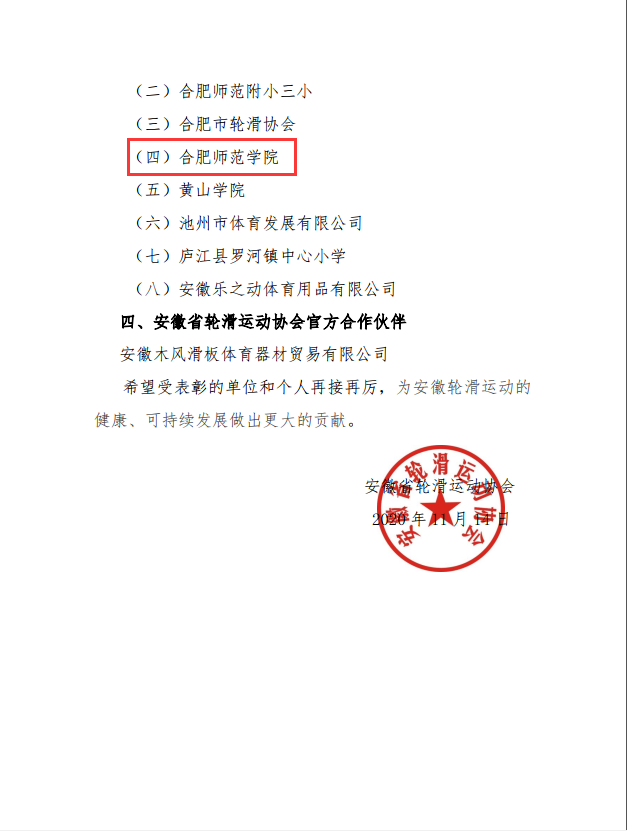 会议还对近年来为我省轮滑事业作出突出贡献和成绩的单位及个人进行了表彰,我院肖如意老师获评安徽省轮滑先进工作者,学院获评安徽省轮滑推广单位。