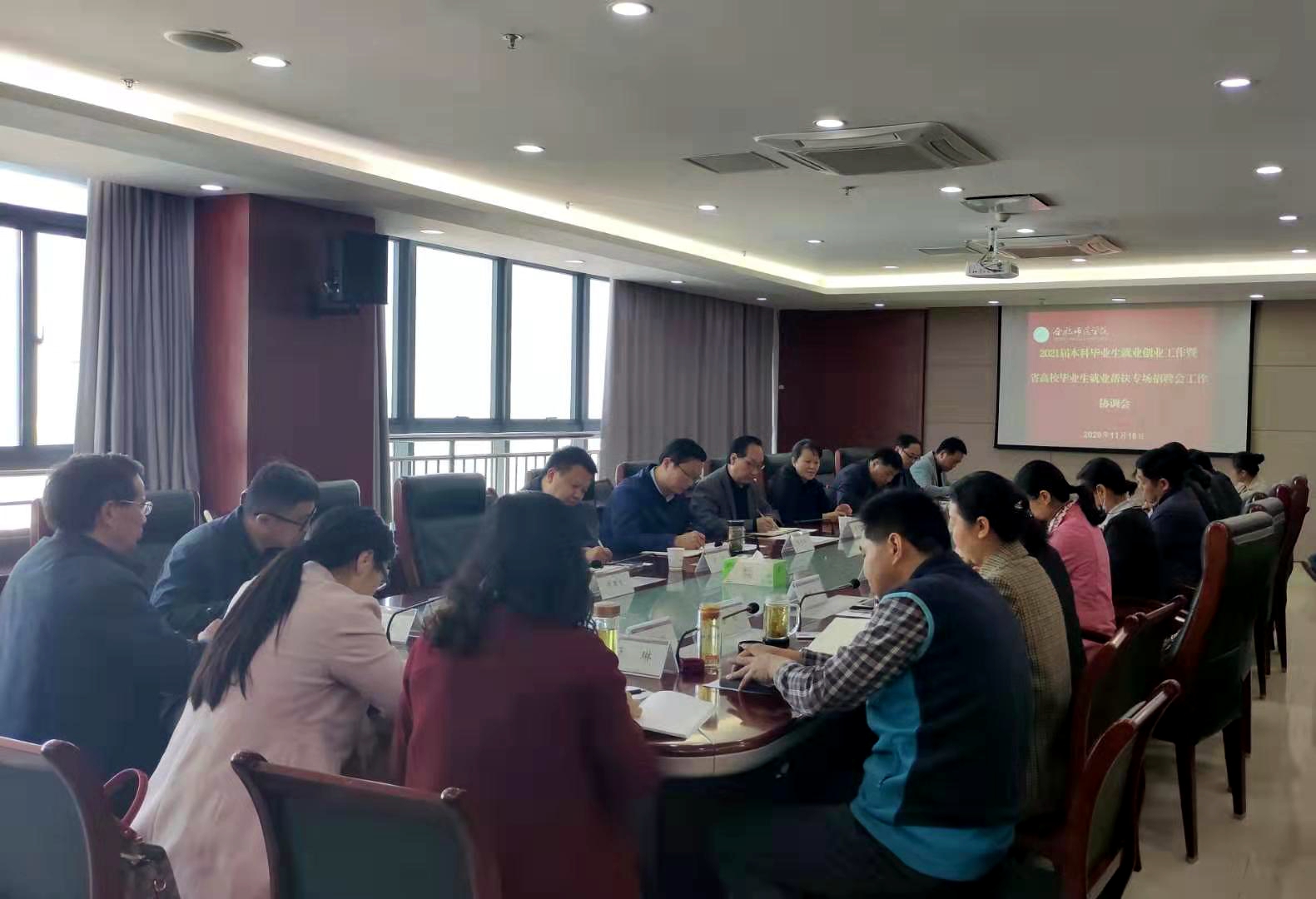 本网讯 为更好地做好疫情防控常态化下的毕业生就业创业工作,协调做好安徽省2021届高校毕业生就业帮扶专场招聘会承办工作,11月18日上午,学院在锦绣校区行知楼第二会议室召开2021届本科毕业生就业创业工作暨安徽省2021届高校毕业生就业帮扶专场招聘会工作协调会,党委委员、副院长姚本先出席会议并讲话,就业创业工作处、办公室、宣传部、后勤处(校医院)、保卫处等部门主要负责人和各二级学院党委(党总支)书记参加会议。会议由就业创业工作处处长马平主持。