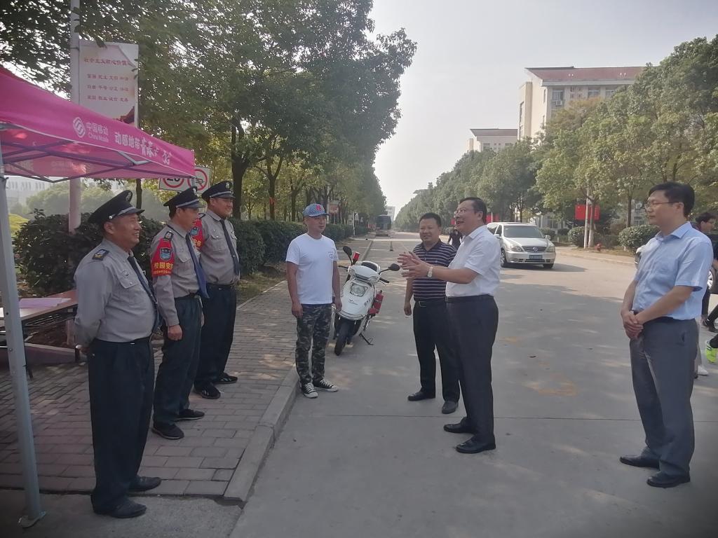 徐成钢一行先后实地查看了锦绣校区、滨湖校区的门卫岗亭、总值班室、食堂、医学隔离观察点、学生公寓等场所,与教职员工亲切交谈,详细了解中秋国庆假期期间安全保卫、值班值守、后勤保障、学生生活与学习、校园环境与卫生等情况,对他们的辛勤工作表示肯定,嘱咐大家注意休息、保重身体,并向他们致以节日的问候和祝福。