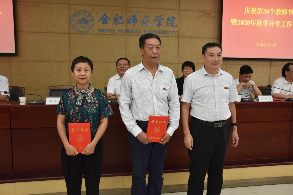 会上,李进华为教龄满30周年(女满25周年)教师颁发纪念证书;吴昕春为首批“双带头人”教师党支部书记工作室授牌;姚本先宣读了表彰2020年“江博杯”“学陶师陶——三育人”先进个人的决定;全体院领导为受到表彰的先进个人颁奖。