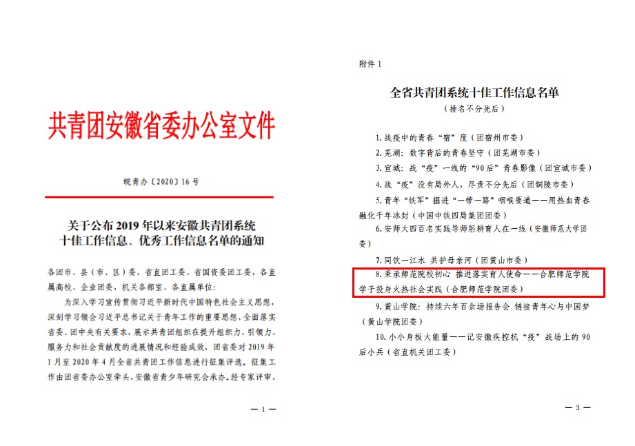 本网讯 近日,由共青团安徽省委主办、安徽省青少年研究会承办的2019年度“安徽共青团系统十佳工作信息、优秀工作信息”评选结果揭晓,我院团委报送的信息《秉承师范院校初心 推进落实育人使命 beat365唯一官方网站学子投身火热社会实践》(作者:王露)获评“全省共青团系统十佳工作信息”。