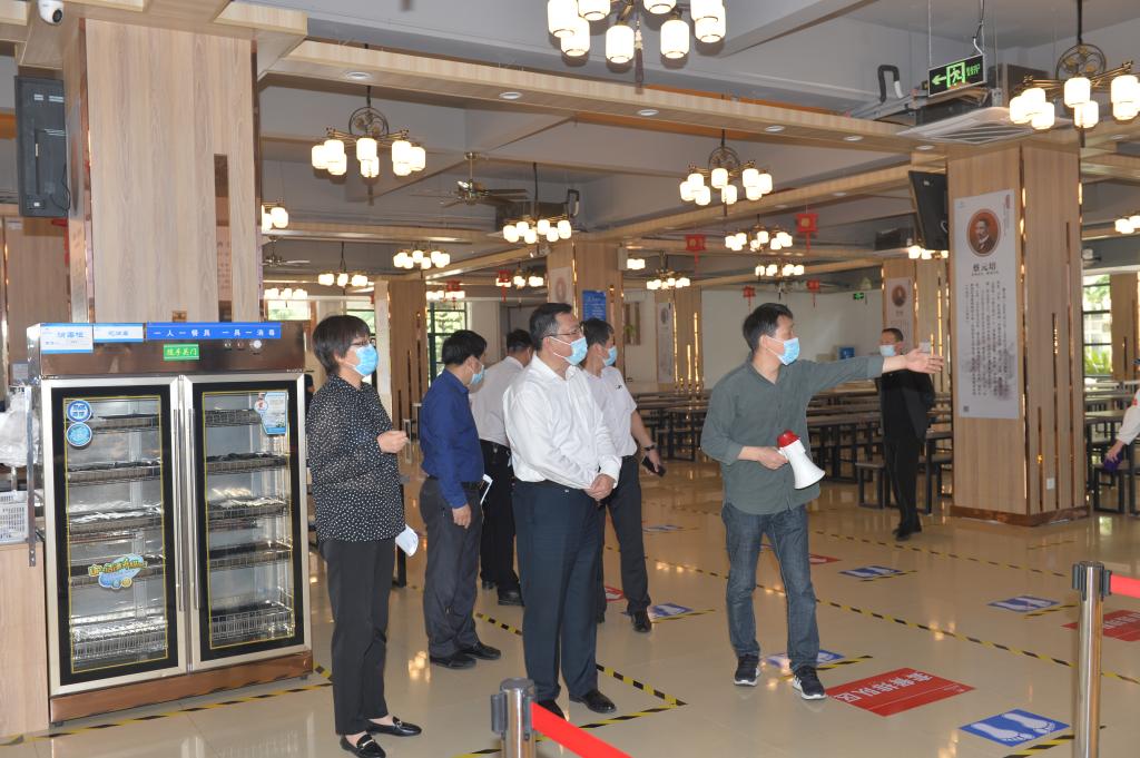 院领导一行先后来到门卫岗亭、教学楼、校医院、食堂、宿舍、集中隔离观察点等场所,现场听取办公室(防控办)负责同志关于本次检查基本安排的总体汇报、学生处学生返校信息查验和登记安排情况汇报、保卫处校门出入管控措施汇报、宣传部校园疫情防控氛围营造措施汇报、教务处本科生教学总体安排汇报、研究生处研究生教学总体安排汇报、后勤处关于食堂、浴室、超市等场所的相关管控措施汇报,实地查看校医院有关集中隔离观察点设置、疫情防控物资保障等相关情况和相关学院教学安排及条件到位情况。