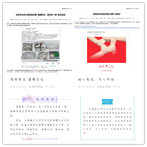 学院学生组织积极开展“众志成城、齐心抗疫”爱心海报制作活动、“防控疫情,我是合师学子我承诺”等多项形式多样的特色活动,提醒学生科学地进行疫情防控,不信谣、不传谣、不造谣;大学生自律委员会凝心聚力、积极面对疫情挑战开展“暖心抗疫,齐心行动”新春主题战“疫”活动和“居家防疫,健康生活”活动,增强同学们的防护意识,宣传和引导各种室内活动和居家健康生活的方式,团结广大同学,做好防护,共抗疫情。(学生工作处:葛畅)