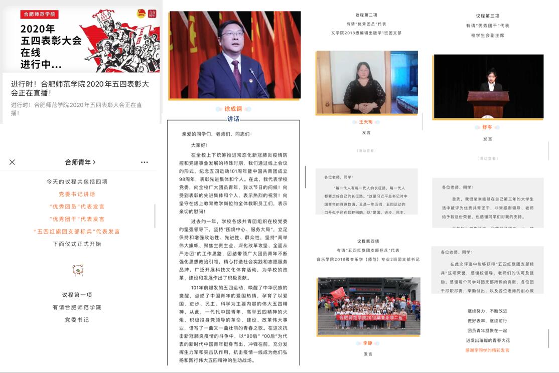 本次线上表彰大会通过“合师青年”微信公众号发布,各二级学院及时组织广大团员青年观看学习。“合师青年”微信号还将以线上发布光荣榜的形式对学院2019年度优秀共青团员、优秀共青团干部、五四红旗团支部标兵、五四红旗团支部进行表彰。(院团委)