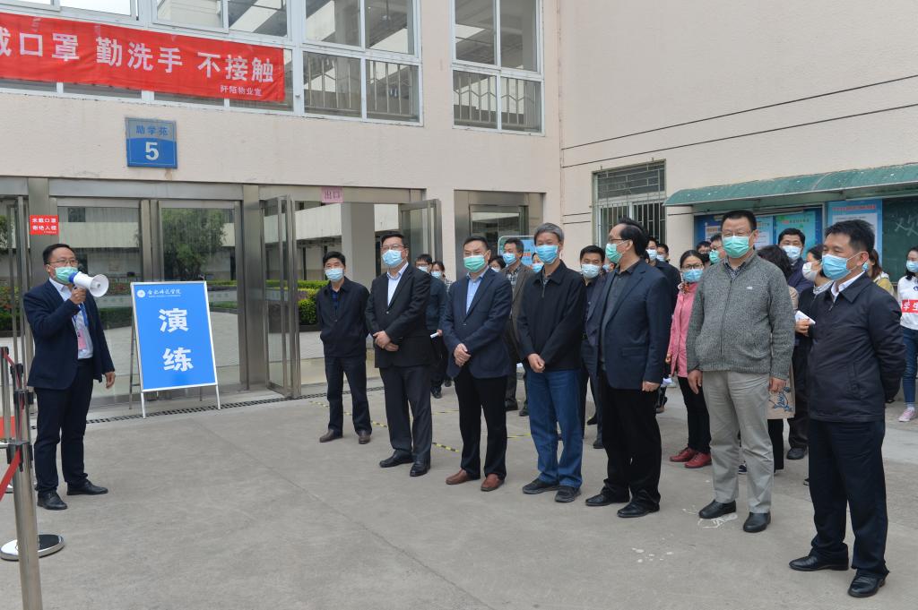 本网讯 4月27日下午,学院在锦绣校区组织开展2020年春季学期学生返校应急处置模拟演练。党委书记徐成钢,党委副书记、副院长李进华,党委副书记吴昕春,副院长谢阳群,副院长姚本先,副院长曹卓良,纪委书记徐文林,学院疫情防控工作领导小组相关职能部门负责人,二级学院分党委(党总支)书记、副书记到场观摩,办公室、学生工作处、后勤处、保卫处工作人员和全体辅导员100余人参与演练。