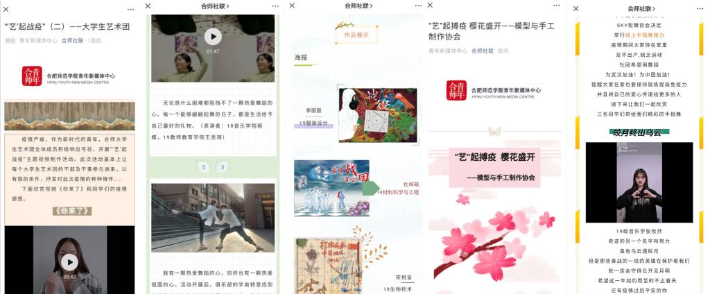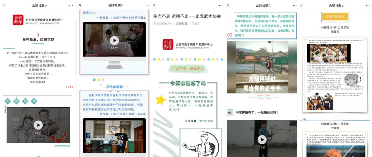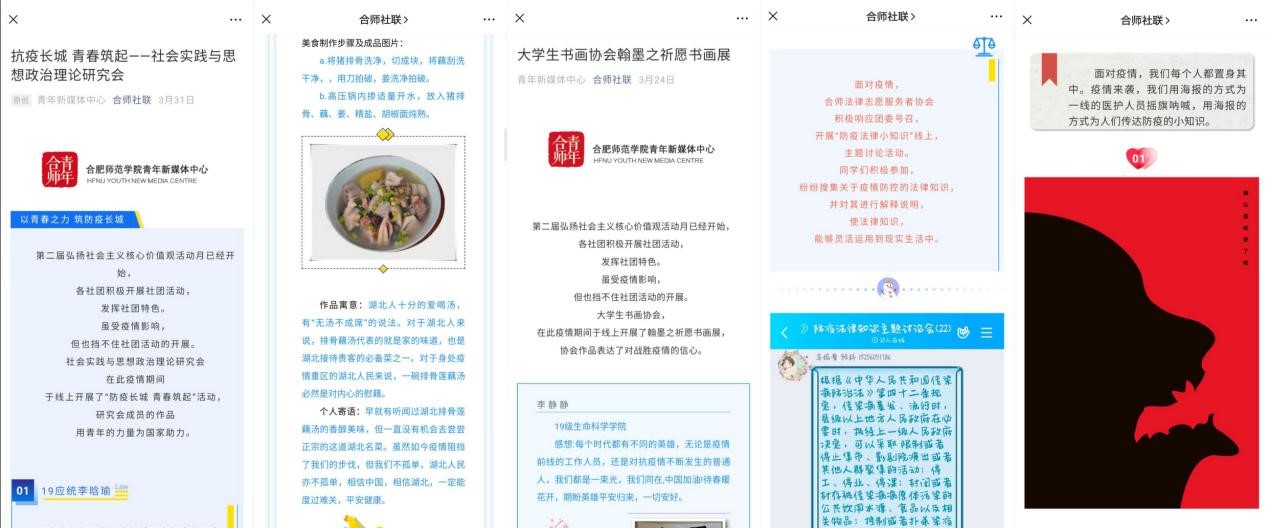 疫情防控期间,学院在各学生社团建立了团支部,各学生社团团支部充分发挥战斗堡垒作用,围绕疫情防控大局,结合自身社团特点,充分挖掘了学生社团活动的育人元素,通过丰富多彩的学生社团活动展现出合师青年学子万众一心、众志成城抗击疫情的坚定决心,积极乐观、健康阳光的精神风貌。(院团委学生记者:陈其美 周艳)