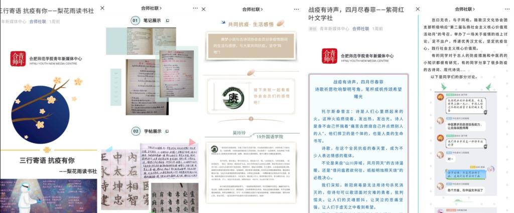 思想政治类和学术科技类社团坚持弘扬主旋律,立足传统文化,开展主题活动。社会实践与思想政治理论研究会举办 “防疫长城 青春筑起”活动,通过海报、视频、文字等形式为打赢疫情防控阻击战鼓劲加油;基础教育研究会举办“社会主义核心价值观学习交流会”以文字的形式描述个人居家的学习生活经历、学习一线医护人员的先进事迹;在赓梦小说与古诗词协会的“我想分享的……”活动中,同学们分享了宅家期间的趣事和感想;踏歌汉文化协会的同学们在线上讨论古代汉文化中和疫情有关的古诗词,弘扬中华悠久历史长河中中国人民团结一致抗击疫情的民族精神;大学生英语协会以“英协相伴,‘疫’起加油”为主题组织同学们给外国友人写一封英文防疫常识信;紫荷红叶文学社的“战疫有诗声,四月尽春菲”活动中,组织同学们创作诗歌歌颂一线医护人员奋不顾身、为民服务的优秀品质。