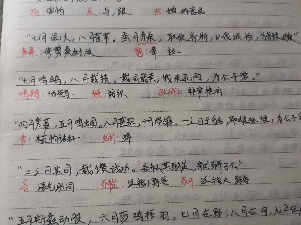 一首《七月》开启了学习《诗经》的序幕,这是一首以季节时间为主线来书写的古代诗歌,通过大量细节描写,描绘了古代男女农人的劳动生活,通过物候特征表现出节令的变化。老师采用“观看网课视频——了解文章大意”和“直播课堂——精细分析文句”相结合的方式,在与同学相互交谈中,准确传神地讲授文章的知识点,并及时提出一些小问题加深我们对于字词、语句的理解。