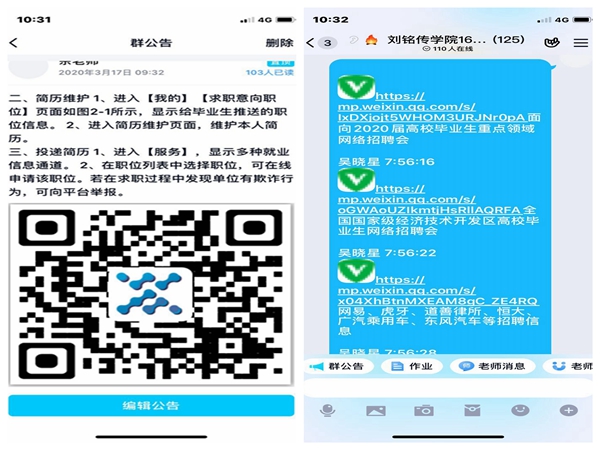 广泛宣传就业信息,提升学生参与热情。学院通过学校就业创业工作网、安徽省大学生就业服务平台、大型招聘网站等多种渠道广泛收集就业信息,及时在班级群内发布,激发毕业生求职热情,引导毕业生广泛参与求职。截至目前,学院毕业生通过各种网络渠道参与求职率接近90%,其中在安徽省大学生就业服务平台上参与春季网络招聘会、投递简历总数占毕业生总人数的136%。
