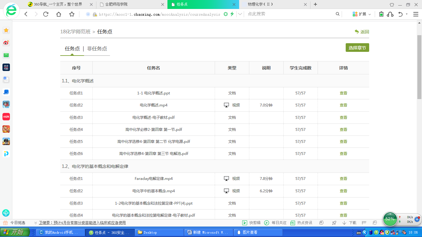 我主要选择了超星尔雅(学习通)教学平台进行网络课程建设。根据化学专业新版培养方案的要求,我将教学内容进行了重新设计,使之与中学化学教材内容相联系,同时将课程ppt,微课视频、教材电子版、与课程内容相关的部分高中化学教材电子版等学习材料提前传至教学平台。