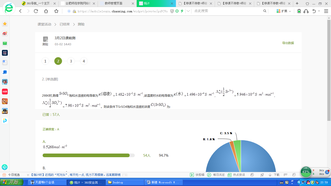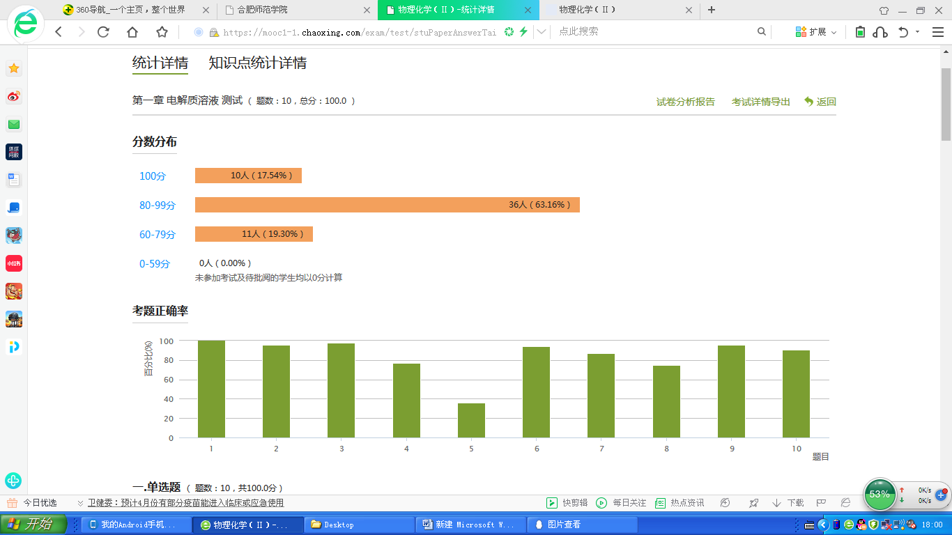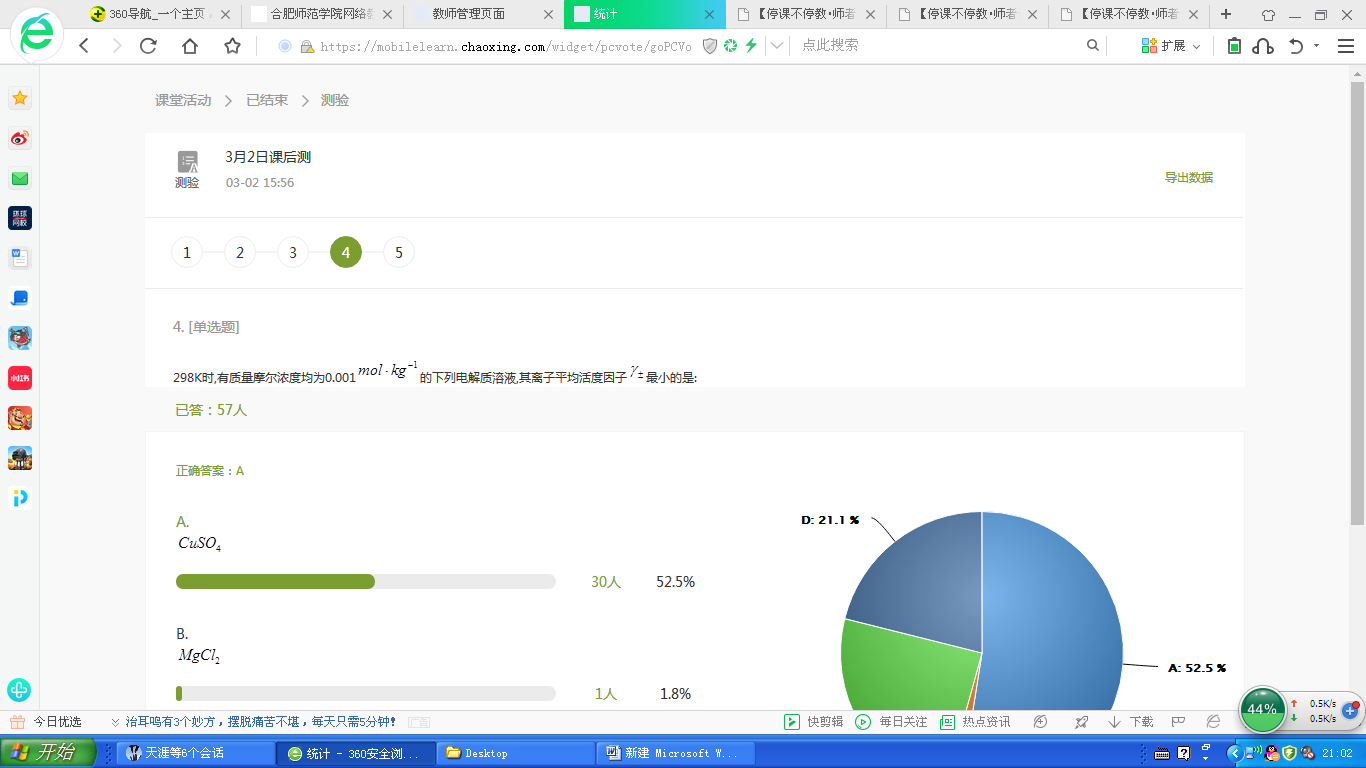 开学至今,因上课时间在线用户过多,无法顺利使用教学平台进行在线直播,因此,我选择了课上比较方便与学生进行互动、而且直播内容可以回放的“腾讯课堂”进行课程直播,对课程中涉及的重、难点进行讲解,对测试及作业中存在的问题与同学们探讨。同时还采用超星尔雅(学习通)网络教学平台进行课堂签到、课前测、课后测、章节考试等各种活动。