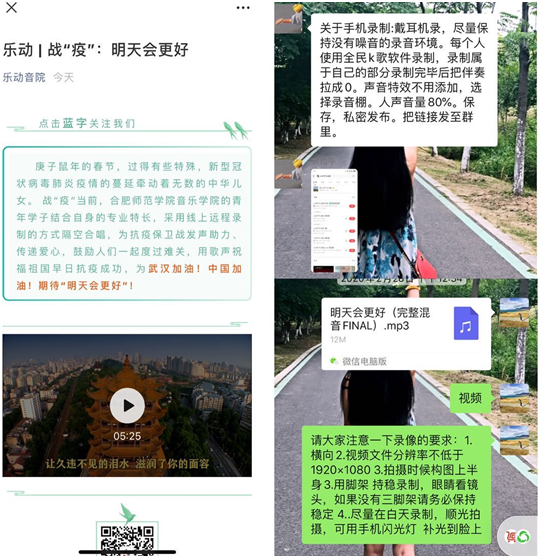 谭映老师结合专业特点,策划了“乐”动战疫活动,鼓励同学们用自己的声音为湖北加油、为武汉加油,为抗疫加油。她选择了《明天会更好》作为合唱歌曲,让每一位同学都录制自己视频。此次活动共有16名同学参与,2016级音乐学专业吴钧平和17级音乐学专业邵伟伟主动承担了音频和视频的制作剪辑工作。没有专业的录音设备和环境,如何在设备不统一、环境不一致的前提下,录制出相对高质量的音频,是必须解决的问题。为了录制出相对高质量的视频,她带领团队提前拟定了录制注意事项,对录制软件、录制方式、录制环境进行了统一要求。前期,大家依托曲谱、歌词和伴奏完成了独自排练,为了呈现最好的演唱效果,反复用手机录制好各自的演唱音频、视频。