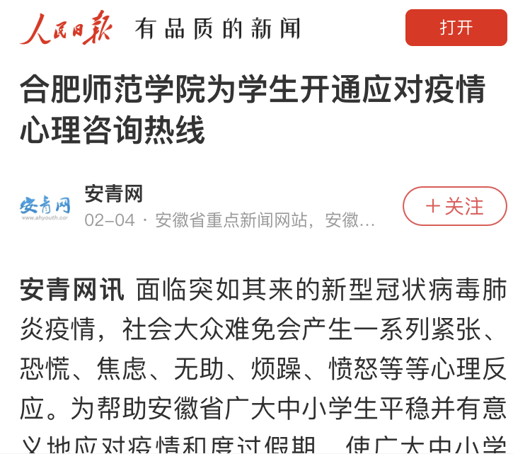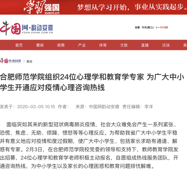 1月31日,在院党委的领导下,教师教育学院组织心理学系教师以学校名义与安徽省教育学会联合编写《中小学生应对新型冠状病毒肺炎疫情心理自助指南》,为我省广大中小学生提供关于自我心理维护的科学理论、方法与手段。指南推出后,受到各界广泛关注,省内外众多媒体给予了采访报道。1月31日,中安在线网以《中小学生应对疫情的心理自助建议指南来了》为题进行了专题报道。2月1日,省教育厅官微对指南进行了全文转载。此外,人民网、新华网、“学习强国”学习平台、安徽日报、凤凰网、安徽商报等先后对指南内容进行了报道或转载。