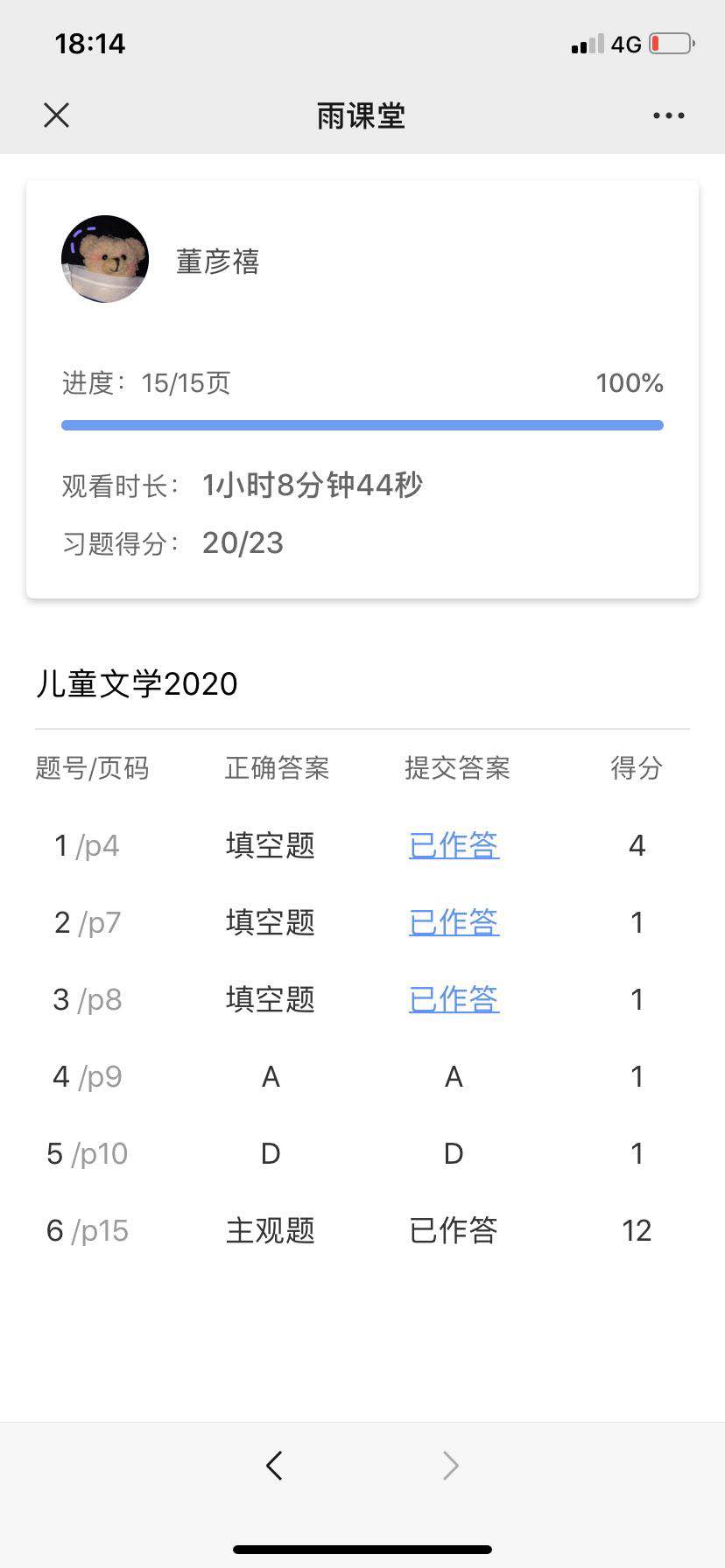 关于《外国文学》与《儿童文学》两门课的基础知识,已有相对优秀的慕课视频资源讲解,我通过链接的方式把视频资源关联到了“雨课堂”,制作好包含习题与语音讲解在内的ppt。学生完成ppt一般会保证60—90分钟的观看量,相当于学生上课能够获得的知识讲解。