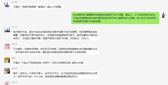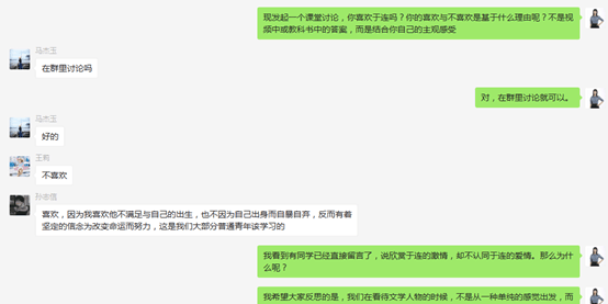 因为课件都提前推送给了学生,所以学生相当于已经完成了初步的知识学习,正式上课时就可以参加答疑或讨论。在传统课堂中,真正能够参与课堂讨论的学生是相当有限的,很多同学参与的积极性不太高。而在线上课程群中,只要同学有想说的,都可以畅所欲言,课堂讨论相对很热烈。