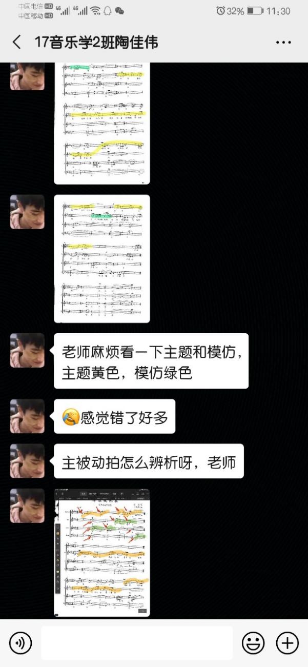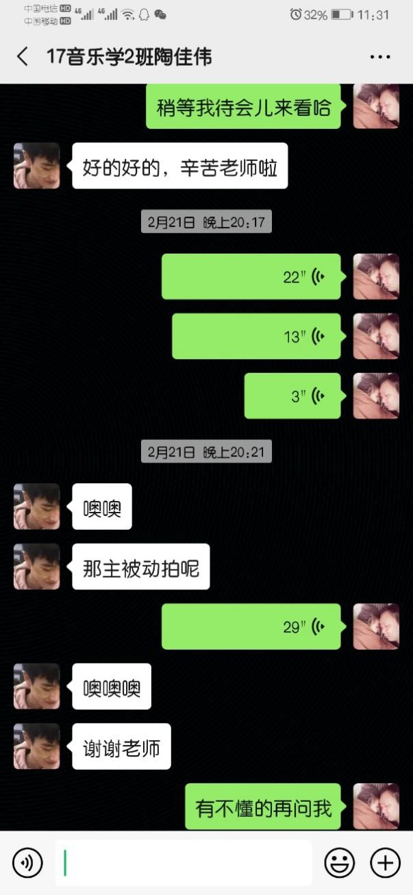 3.利用多平台进行授课,微信群发送语音、“学习通”签到发放资料、作业上传等。由于音乐学和音乐表演专业授课特殊性,学生除了理论教学外,还必须有一定量的实践训练,由此,一方面可以让学生观看教学PPT学习理论知识,另一方面,将老师的示范录制成教学视频,让学生观摩、反复聆听,并让学生将练习的视频上传,以便教师及时指导,这样的综合授课方式,能确保学生线上学习的质量。