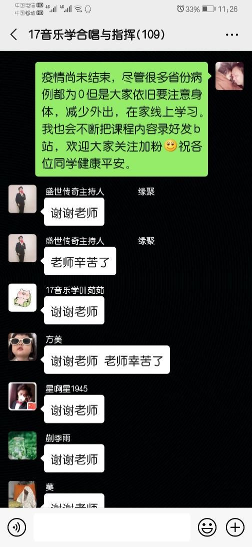 新冠肺炎疫情防控工作开展以来,音乐学院认真贯彻落实上级和学校关于做好“停课不停教、停课不停学”的工作要求,迅速组织教师提前备课,熟悉网络教学平台,按照实际情况灵活制定教学计划,发布学习任务,创新教学方法。展示了教师勇于担当、敬业奉献的良好精神风貌。