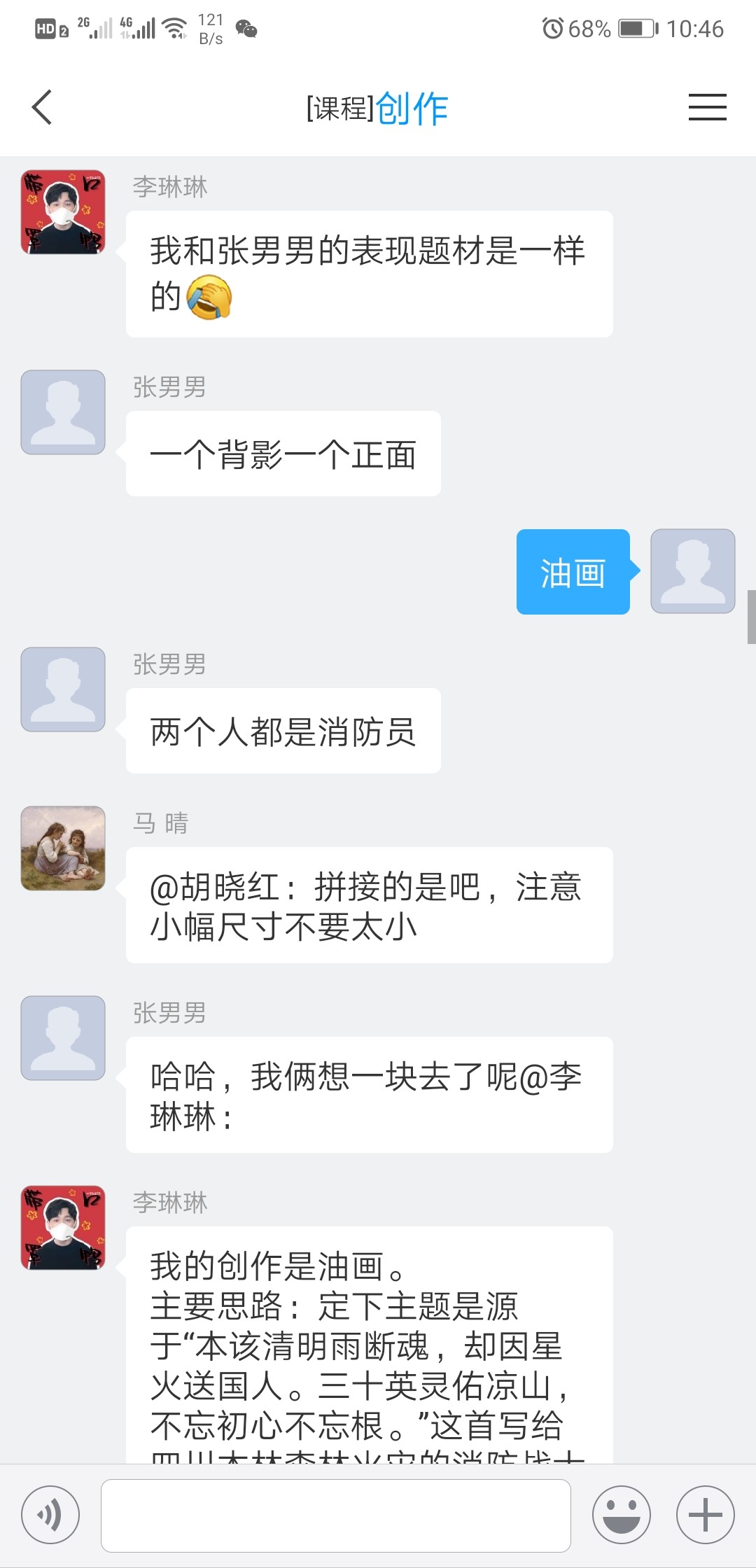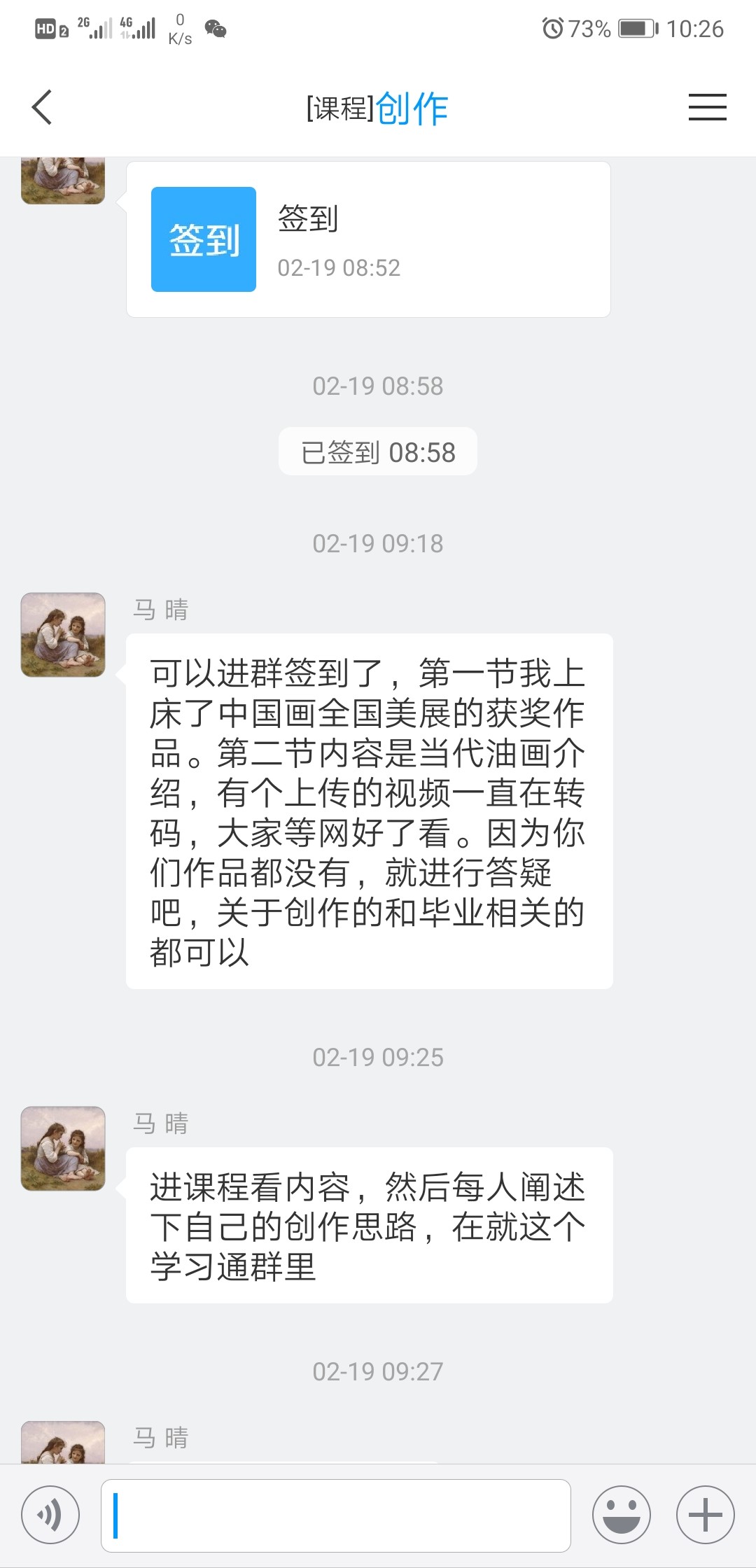 场景一:“万事俱备,只欠东风”。2月17日早上八点,我的第一节课“开张”,经历“早高峰”后,学生们纷纷进课堂签到,看着平台上不断跳动的数字,我知道真正的考验开始了。《创作》是美术学专业大四的课程,学院一再告知,这是本科生毕业创作(论文)改革后第二届学生,要在上一届经验基础上,提升质量。好在学生我都熟悉,比较好地克服了网络平台不熟悉的不利情况。“沟通与交流”、“研讨与碰撞”,学生们基本完成毕业创作初稿,纷纷晒出作品照片大家一起点评,商讨修改,热火朝天,合上了本院毕业创作(论文)工作节奏。