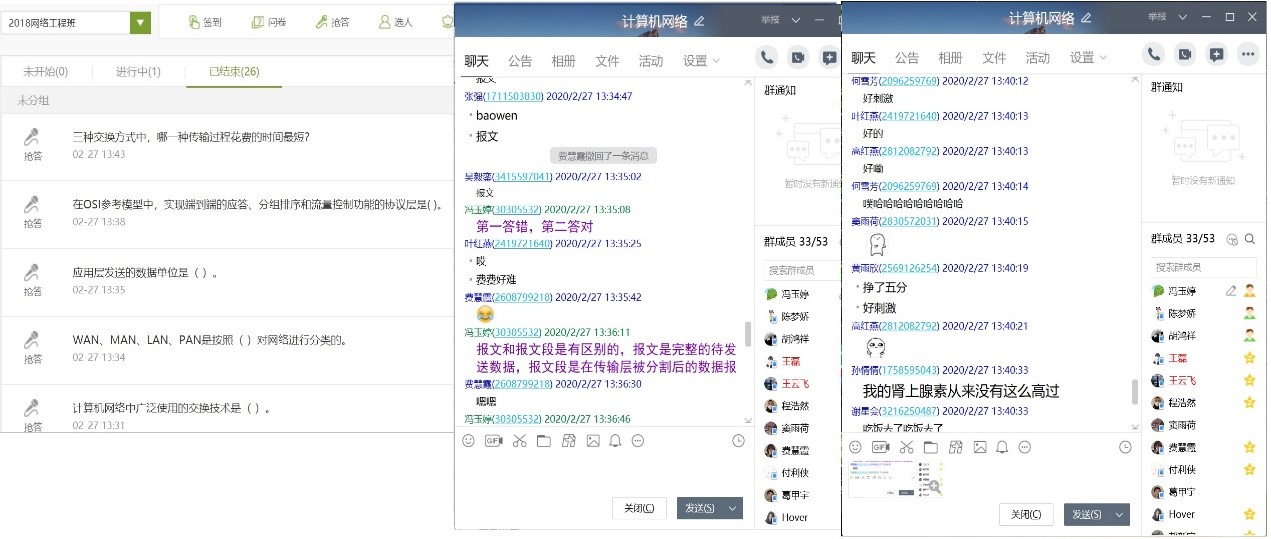 对于《计算机网络》这门课程来说,线上教学并不陌生。在翻转课堂的教学改革中,我们已经具备基于SPOC的线上/线下教学模型,多种项目启发式的线下教学设计活动,部分线上知识点的教学视频和配合使用的超星网络在线平台。但面对突如其来的纯粹在线教学,原有的教学模型和教学设计方案几乎全部需要调整。主要问题集中在以下几个方面:一是“线上/线下教学模式”是通过“线上自学视频+线下课堂复习测验”来培养学生自学习惯并监督学生的学习效果。而在纯粹在线教学环境下,一些较复杂的知识点难以通过在线视频进行讲授。同时,缺少了线下课堂的“面对面”环境,难以实时掌握学生真实的学习情况。二是原有的超星网络平台虽然具备强大的课程建设和学生管理功能,但是由于在线直播对服务器的处理能力要求较高,容易产生卡顿或者网络崩溃等无法预见的后果。三是如果按照课堂教学时间要求学生在线学习,学生需要连续一个多小时观看直播或线上视频,长时间对着电脑或者手机学习,不仅考验学生的自制能力,也不利于学生健康。