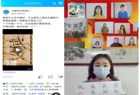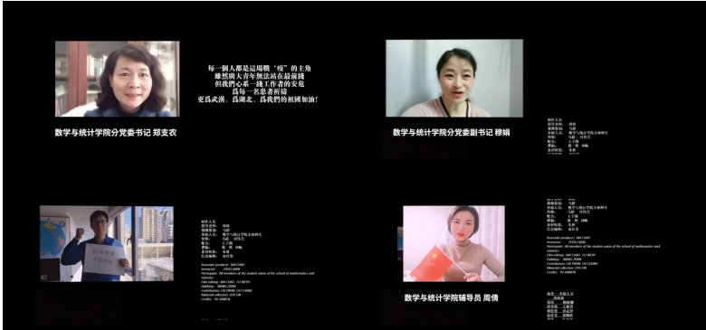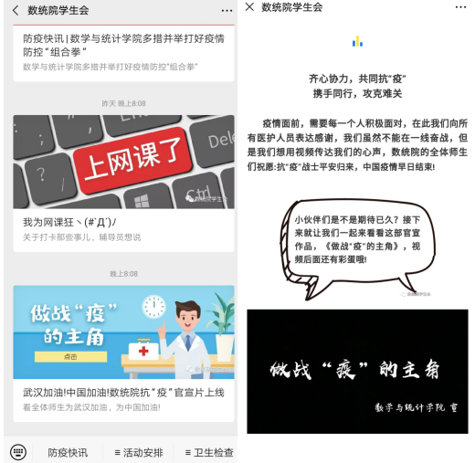 数学与统计学院学生会在分团委书记周倩的指导下,制作了《做战“疫”的主角》微视频,从“00后”大学生的第一视角展现了新冠肺炎疫情之下当代大学生的思考,通过“抗击疫情,你在做什么?”接力的形式展现出数统学子健康向上的精神面貌。全体学工队伍、学院分党委书记、辅导员们也参与了该视频的录制,通过镜头的形式将祝福与期望传递给每一个数统学子,为武汉加油,为中国加油。该微视频也通过数统院、校合师青年官方微信平台和抖音号进行了宣传。该片由于贴合学生实际,得到了广大学生的喜爱与好评。
