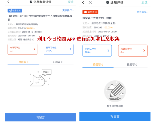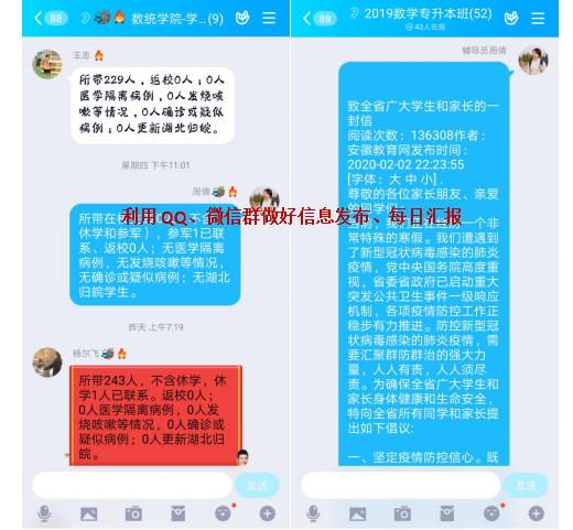 学院24个班级1205名在籍学生的健康安全牵动着全院老师,特别是学工人的心。自疫情开始以来,学院5名辅导员积极利用QQ、微信、今日校园APP等线上平台进行疫情通知宣传、疫情预警、信息收集等工作,尤其是作为组长的杨尔飞每日及时汇总数据、准时上报,认真做好与学校对接工作,织牢校园防控“安全网”。上下联动,主动出击,通过多途径广泛开展防疫宣传,将教育部和安徽省教育厅《致广大学生和家长一封信》等重要信息传达到每一位学生,做到百分百全员全覆盖;通过“大数据+网络化”新型手段建立起逐级汇报的监控网络;通过今日校园APP开展辅导员点对点“扁平化”管理,做到数据精准、不留死角;通过电话、视频、聊天工具对于身体不舒服、有武汉接触史等学生开展谈心谈话,做到主动关心、密切关注、做好心理疏导和情绪安抚工作。