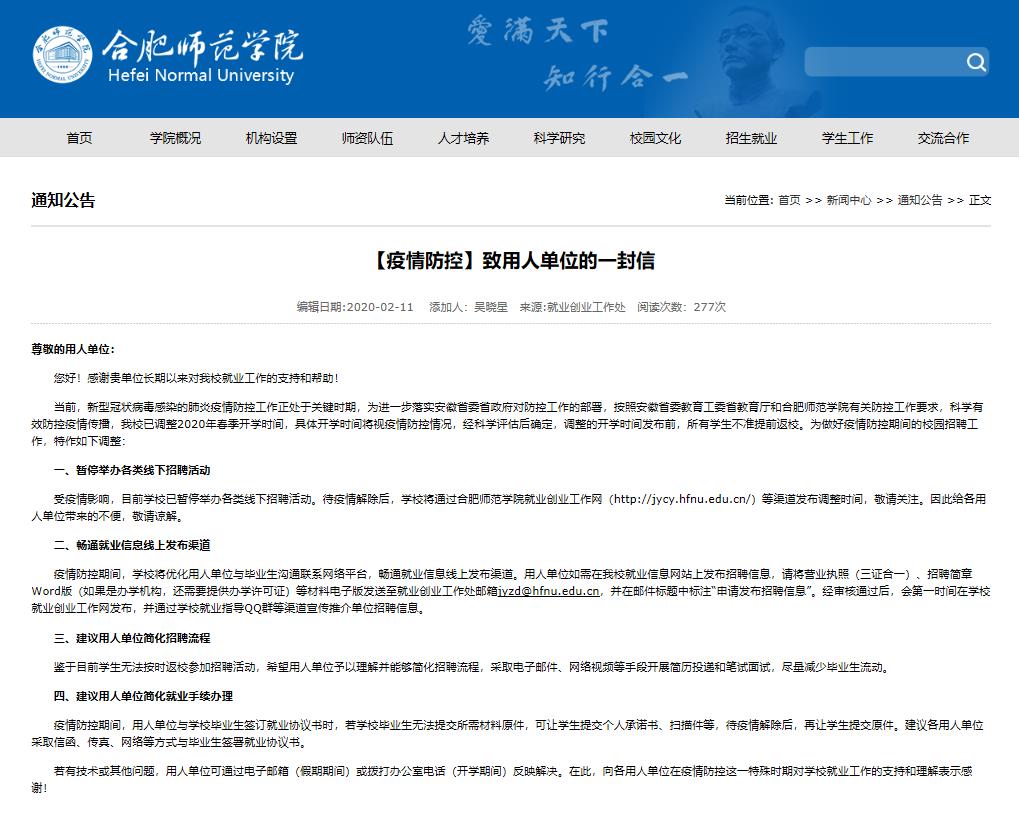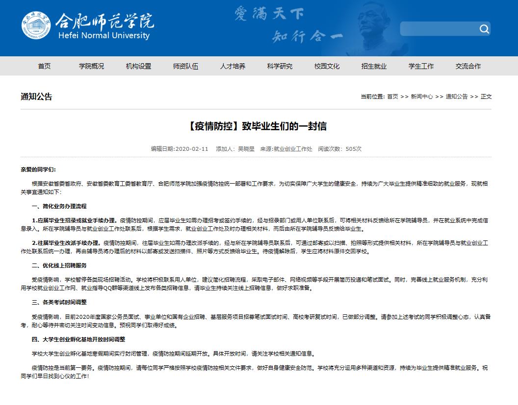 就业创业工作处面向毕业生发出《致毕业生们的一封信》,详细告知应届和往届毕业生在疫情防控期间办理招考或签约手续所需流程,通过网上申请、在线审核、远程反馈等形式实现一网通办,减少人员流动带来的安全隐患。