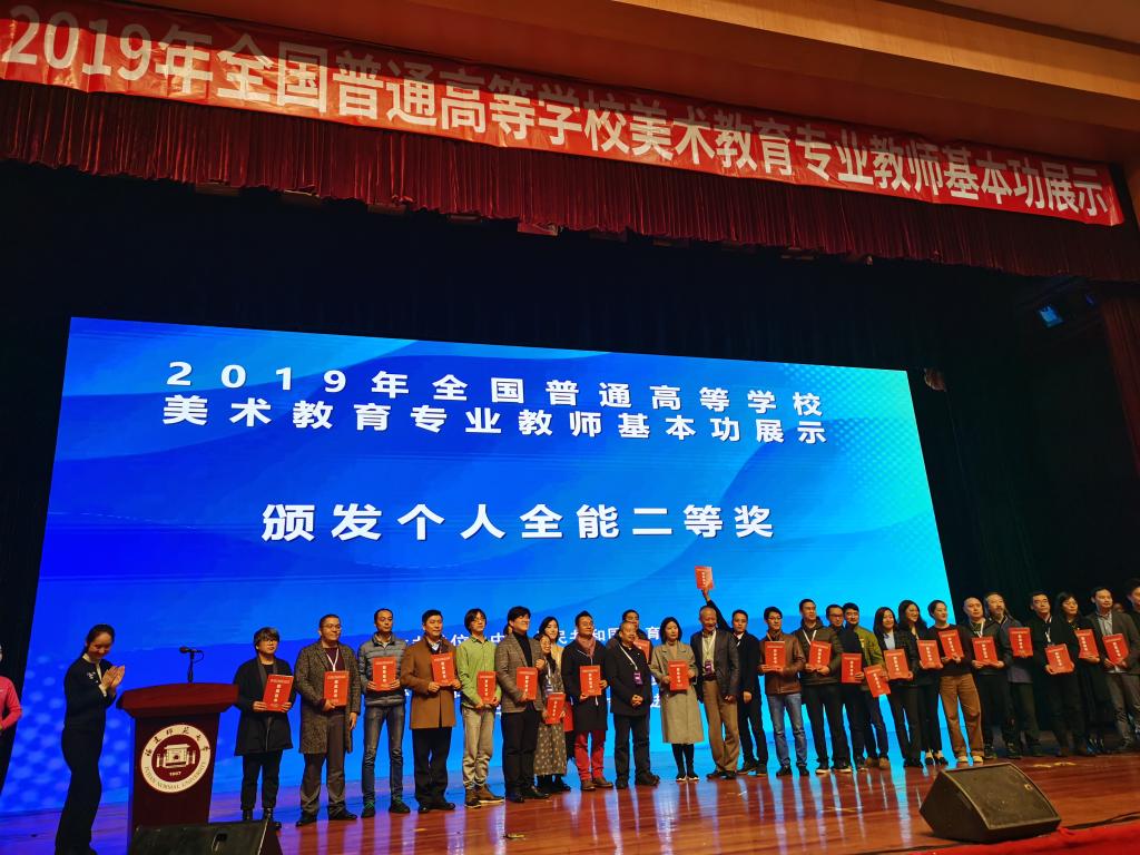 2019年全国普通高校美术专业教师基本功展示分为实践组和理论组两个组别,每组分设教学展示、专业能力展示、经典作品赏析三个项目。在本次展示活动中,我校艺术传媒学院代表队教师取得了优异成绩,胡亮老师获得实践组个人全能二等奖、实践组专业能力展示单项奖,马晴老师获得理论组经典作品赏析单项奖,韩岩岩老师获得实践组教学展示单项奖。