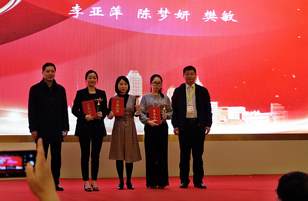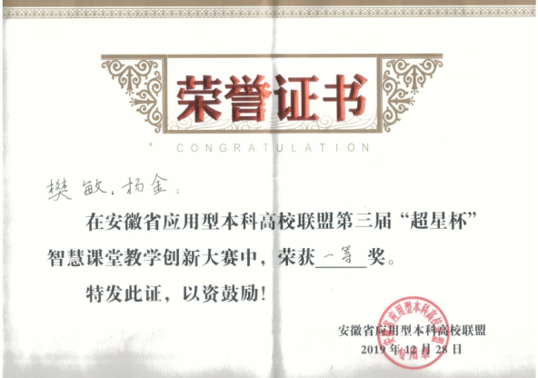 本网讯 12月28日,安徽省第三届“超星杯”智慧课堂教学创新大赛决赛在巢湖学院成功举办。经过激烈角逐,我院电子信息与电气工程学院樊敏和杨金老师教学团队获一等奖,外国语学院黄莹老师获二等奖,外国语学院钱莉娜老师获2019年度智慧课堂“教学之星”称号。本次比赛由安徽省应用型本科高校联盟主办、巢湖学院承办,来自全省各高校领导、教师500余人观摩了比赛,北京世纪超星信息技术发展有限责任公司提供技术支持。